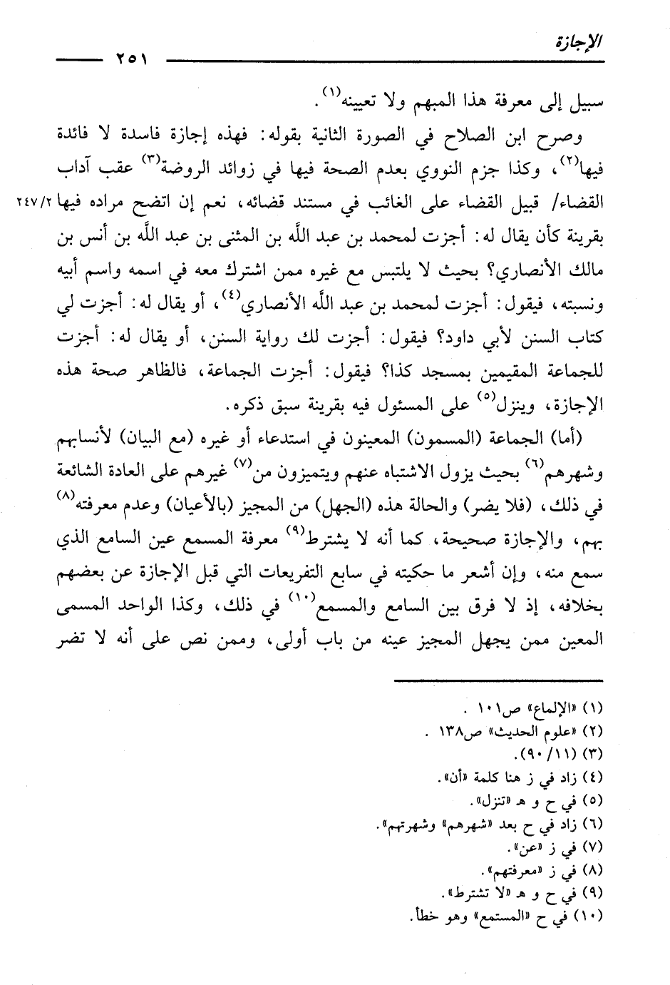 وَصَرَّحَ ابْنُ الصَّلَاحِ فِي الصُّورَةِ الثَّانِيَةِ بِقَوْلِهِ: فَهَذِهِ إِجَازَةٌ فَاسِدَةٌ لَا فَائِدَةَ فِيهَا. وَكَذَا جَزَمَ النَّوَوِيُّ بِعَدَمِ الصِّحَّةِ فِيهَا فِي زَوَائِدِ الرَّوْضَةِ عَقِبَ آدَابِ الْقَضَاءِ قُبَيْلَ الْقَضَاءِ عَلَى الْغَالِبِ فِي مُسْتَنَدِ قَضَائِهِ. نَعَمْ، إِنِ اتَّضَحَ مُرَادُهُ فِيهَا بِقَرِينَةٍ كَأَنْ يُقَالَ لَهُ: أَجَزْتُ لِمُحَمَّدِ بْنِ عَبْدِ اللَّهِ بْنِ الْمُثَنَّى بْنِ عَبْدِ اللَّهِ بْنِ أَنَسِ بْنِ مَالِكٍ الْأَنْصَارِيِّ؟ بِحَيْثُ لَا يَلْتَبِسُ مَعَ غَيْرِهِ مِمَّنِ اشْتَرَكَ مَعَهُ فِي اسْمِهِ وَاسْمِ أَبِيهِ وَنِسْبَتِهِ، فَيَقُولُ: أَجَزْتُ لِمُحَمَّدِ بْنِ عَبْدِ اللَّهِ الْأَنْصَارِيِّ، أَوْ يُقَالُ لَهُ: أَجَزْتَ لِي كِتَابَ السُّنَنِ لِأَبِي دَاوُدَ؟ فَيَقُولُ: أَجَزْتُ لَكَ رِوَايَةَ السُّنَنِ، أَوْ يُقَالُ لَهُ: أَجَزْتُ لِلْجَمَاعَةِ الْمُقِيمِينَ بِمَسْجِدِ كَذَا؟ فَيَقُولُ: أَجَزْتُ الْجَمَاعَةَ، فَالظَّاهِرُ صِحَّةُ هَذِهِ الْإِجَازَةِ، وَيُنَزَّلُ عَلَى الْمَسْئُولِ فِيهِ بِقَرِينَةِ سَبْقِ ذِكْرِهِ.