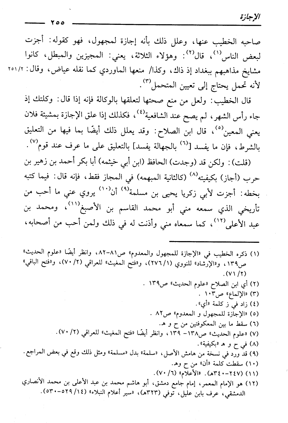 (قُلْتُ) : وَلَكِنْ قَدْ (وَجَدْتُ) الْحَافِظَ (ابْنَ أَبِي خَيْثَمَةَ) أَبَا بَكْرٍ أَحْمَدَ بْنَ زُهَيْرِ بْنِ حَرْبٍ (أَجَازَ) بِكَيْفِيَّتِهِ (كَالثَّانِيَةِ الْمُبْهَمَةِ) فِي الْمُجَازِ فَقَطْ ; فَإِنَّهُ قَالَ فِيمَا كَتَبَهُ بِخَطِّهِ: أَجَزْتُ لِأَبِي زَكَرِيَّا يَحْيَى بْنِ مَسْلَمَةَ أَنْ يَرْوِيَ عَنِّي مَا أَحَبَّ مِنْ تَأْرِيخِي الَّذِي سَمِعَهُ مِنِّي أَبُو مُحَمَّدٍ الْقَاسِمُ بْنُ الْأَصْبَغِ، وَمُحَمَّدُ بْنُ عَبْدِ الْأَعْلَى، كَمَا سَمِعَاهُ مِنِّي، وَأَذِنْتُ لَهُ فِي ذَلِكَ وَلِمَنْ أَحَبَّ مِنْ أَصْحَابِهِ،