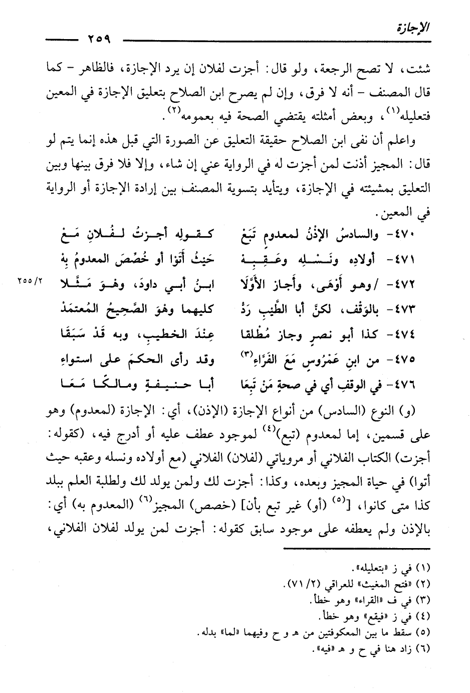 (وَ) النَّوْعُ (السَّادِسُ) مِنْ أَنْوَاعِ الْإِجَازَةِ: (الْإِذْنُ) أَيِ: الْإِجَازَةُ (لِمَعْدُومٍ) ، وَهُوَ عَلَى قِسْمَيْنِ، إِمَّا لِمَعْدُومٍ (تَبَعْ) لِمَوْجُودٍ عُطِفَ عَلَيْهِ أَوْ أُدْرِجَ فِيهِ (كَقَوْلِهِ: أَجَزْتُ) الْكِتَابَ الْفُلَانِيَّ أَوْ مَرْوِيَّاتِي (لِفُلَانٍ) الْفُلَانِيِّ (مَعْ أَوْلَادِهِ وَنَسْلِهِ وَعَقِبِهْ حَيْثُ أَتَوْا) فِي حَيَاةِ الْمُجِيزِ وَبَعْدَهُ، وَكَذَا: أَجَزْتُ لَكَ، وَلِمَنْ يُولَدُ لَكَ، وَلِطَلَبَةِ الْعِلْمِ بِبَلَدِ كَذَا مَتَى كَانُوا، [ (أَوْ) غَيْرَ تَبَعٍ بِأَنْ] (خَصَّصَ) الْمُجِيزُ (الْمَعْدُومَ بِهْ) أَيْ: بِالْإِذْنِ، وَلَمْ يَعْطِفْهُ عَلَى مَوْجُودٍ سَابِقٍ، كَقَوْلِهِ: أَجَزْتُ لِمَنْ يُولَدُ لِفُلَانٍ الْفُلَانِيِّ،
