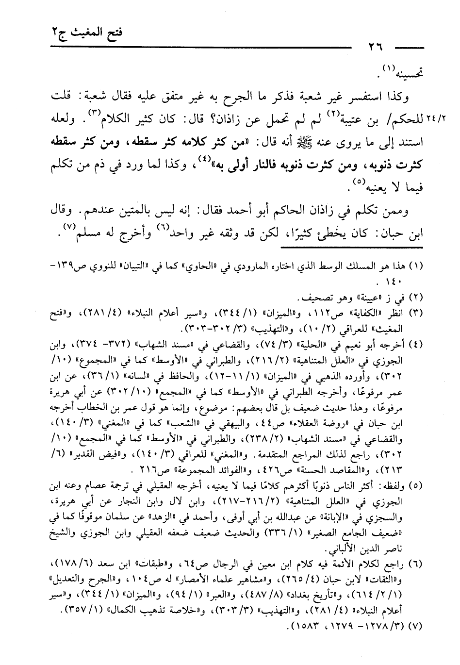 وَكَذَا اسْتَفْسَرَ غَيْرُ شُعْبَةَ، فَذَكَرَ مَا الْجَرْحُ بِهِ غَيْرُ مُتَّفَقٍ عَلَيْهِ، فَقَالَ شُعْبَةُ: قُلْتُ لِلْحَكَمِ بْنِ عُتَيْبَةَ: لِمَ لَمْ تَحْمِلْ عَنْ زَاذَانَ؟ قَالَ: كَانَ كَثِيرَ الْكَلَامِ.