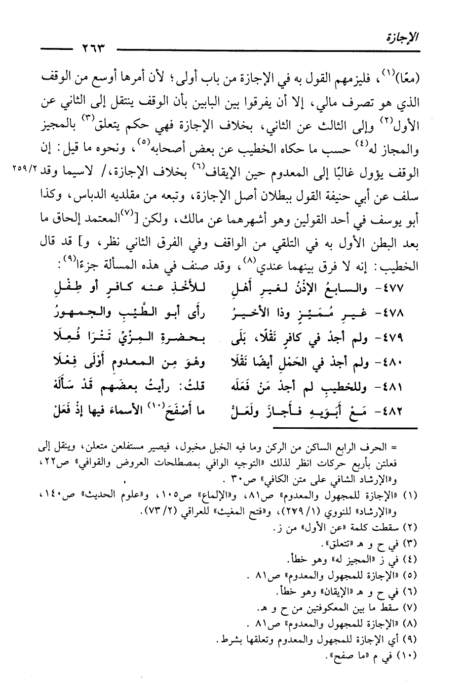 (مَعَا) ، فَيَلْزَمُهُمُ الْقَوْلُ بِهِ فِي الْإِجَازَةِ مِنْ بَابِ أَوْلَى ; لِأَنَّ أَمْرَهَا أَوْسَعُ مِنَ الْوَقْفِ الَّذِي هُوَ تَصَرُّفٌ مَالِيٌّ، إِلَّا أَنْ يُفَرِّقُوا بَيْنَ الْبَابَيْنِ بِأَنَّ الْوَقْفَ يَنْتَقِلُ إِلَى الثَّانِي عَنِ الْأَوَّلِ، وَإِلَى الثَّالِثِ عَنِ الثَّانِي، بِخِلَافِ الْإِجَازَةِ، فَهِيَ حُكْمٌ يَتَعَلَّقُ بِالْمُجِيزِ وَالْمُجَازِ لَهُ حَسَبَ مَا حَكَاهُ الْخَطِيبُ عَنْ بَعْضِ أَصْحَابِهِ، وَنَحْوُهُ مَا قِيلَ: إِنَّ الْوَقْفَ يَئُولُ غَالِبًا إِلَى الْمَعْدُومِ حِينَ الْإِيقَافِ بِخِلَافِ الْإِجَازَةِ، لَا سِيَّمَا وَقَدْ سَلَفَ عَنْ أَبِي حَنِيفَةَ الْقَوْلُ بِبُطْلَانِ أَصْلِ الْإِجَازَةِ، وَتَبِعَهُ مِنْ مُقَلِّدِيهِ الدَّبَّاسُ، وَكَذَا أَبُو يُوسُفَ فِي أَحَدِ الْقَوْلَيْنِ، وَهُوَ أَشْهَرُهُمَا عَنْ مَالِكٍ، [وَلَكِنَّ الْمُعْتَمَدَ إِلْحَاقُ مَا بَعْدَ الْبَطْنِ الْأَوَّلِ بِهِ فِي التَّلَقِّي مِنَ الْوَاقِفِ. وَفِي الْفَرْقِ الثَّانِي نَظَرٌ، وَقَدْ قَالَ الْخَطِيبُ: إِنَّهُ لَا فَرْقَ بَيْنَهُمَا عِنْدِي، وَقَدْ صَنَّفَ فِي هَذِهِ الْمَسْأَلَةِ جُزْءًا.