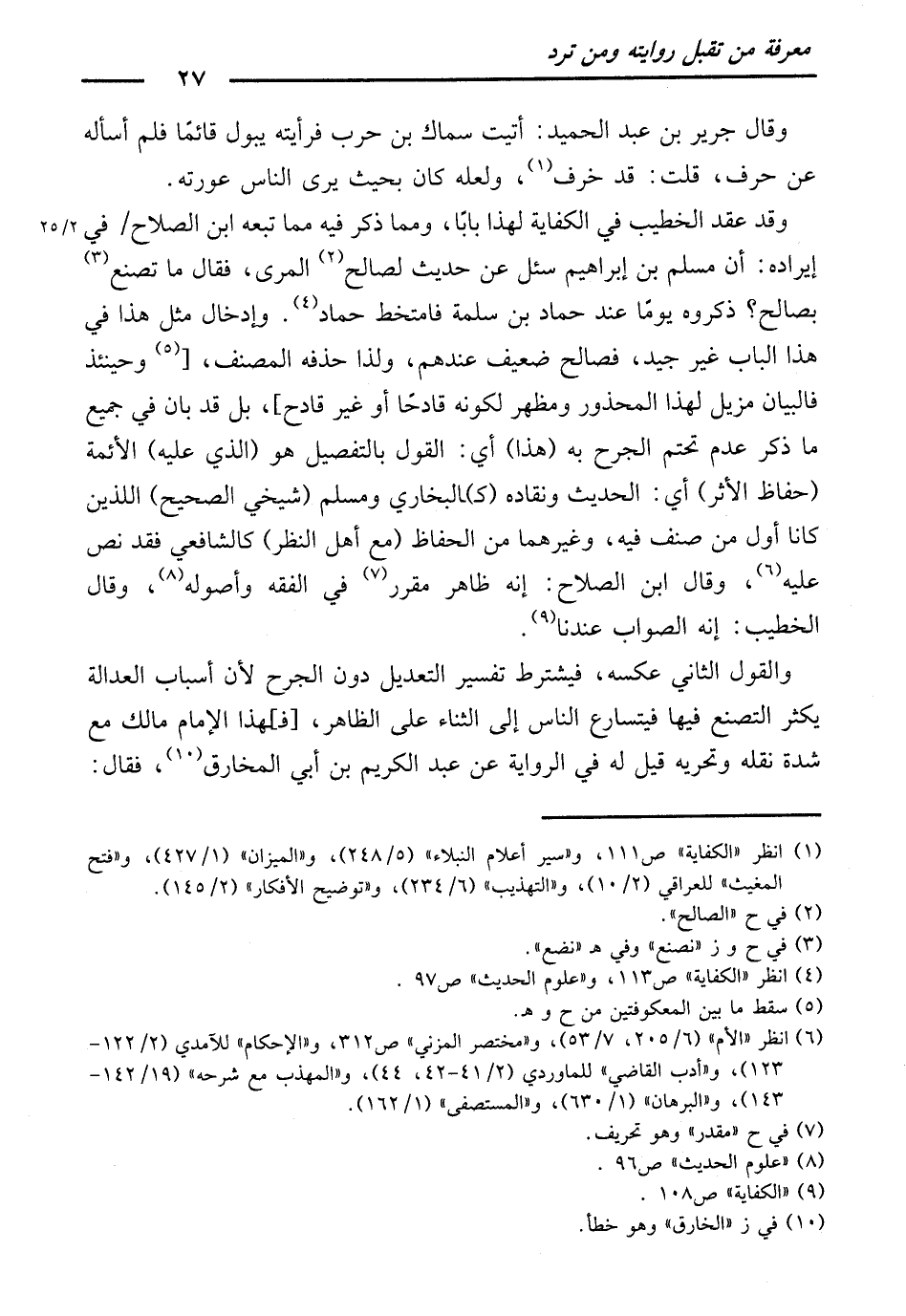 وَإِدْخَالُ مِثْلِ هَذَا فِي هَذَا الْبَابِ غَيْرُ جَيِّدٍ، فَصَالِحٌ ضَعِيفٌ عِنْدَهُمْ، وَلِذَا حَذَفَهُ الْمُصَنِّفُ، بَلْ قَدْ بَانَ فِي جَمِيعِ مَا ذُكِرَ عَدَمُ تَحَتُّمِ الْجَرْحِ بِهِ. (هَذَا) أَيِ: الْقَوْلُ بِالتَّفْصِيلِ، هُوَ (الَّذِي عَلَيْهِ) الْأَئِمَّةُ (حُفَّاظُ الْأَثَرْ) أَيِ: الْحَدِيثِ وَنُقَّادُهُ.