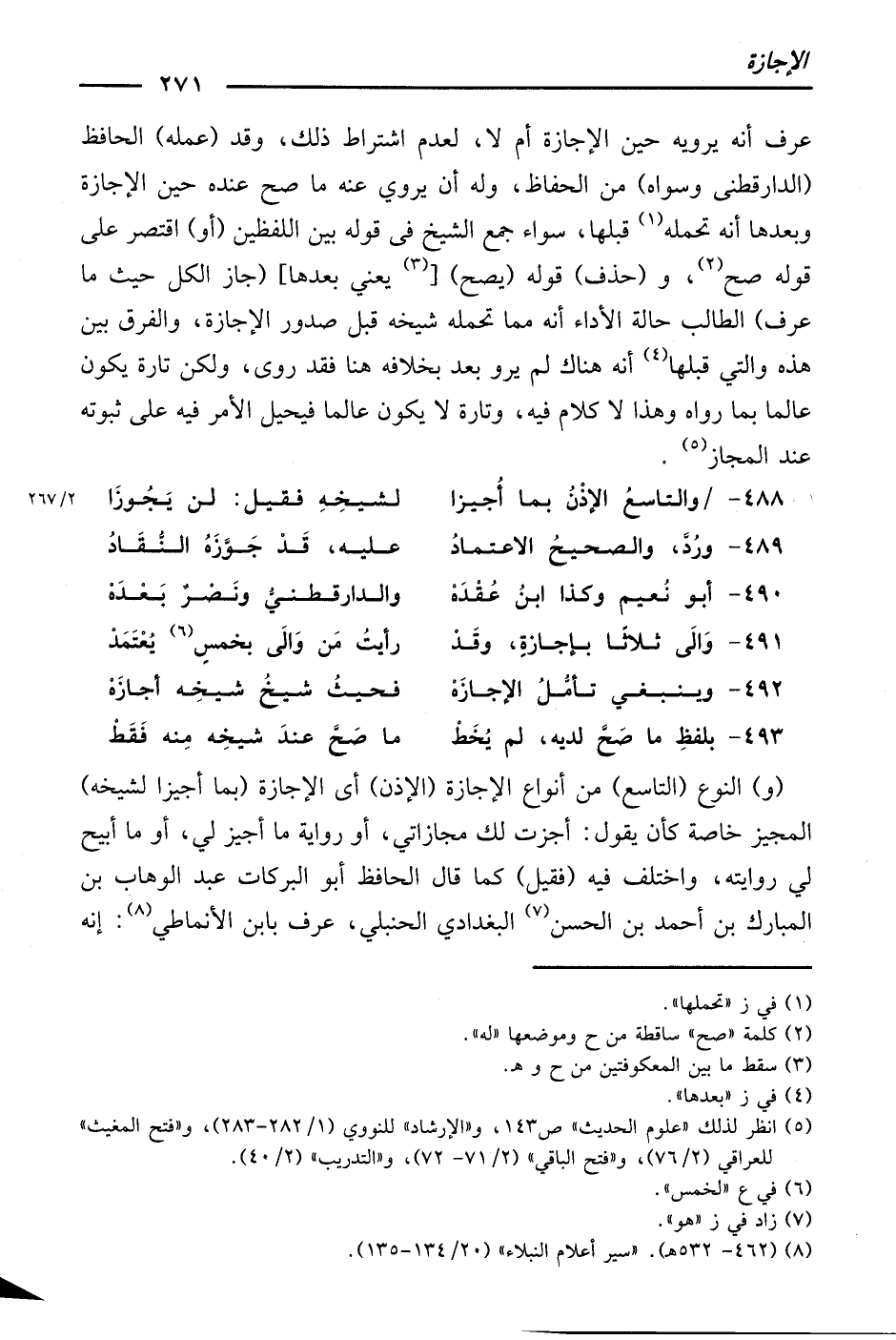 (وَ) النَّوْعُ (التَّاسِعُ) مِنْ أَنْوَاعِ الْإِجَازَةِ: (الْإِذْنُ) أَيِ: الْإِجَازَةُ (بِمَا أُجِيزَا لِشَيْخِهِ) الْمُجِيزِ خَاصَّةً، كَأَنْ يَقُولَ: أَجَزْتُ لَكَ مُجَازَاتِي، أَوْ رِوَايَةَ مَا أُجِيزَ لِي، أَوْ مَا أُبِيحَ لِي رِوَايَتُهُ. وَاخْتُلِفَ فِيهِ (فَقِيلَ) كَمَا قَالَ الْحَافِظُ أَبُو الْبَرَكَاتِ عَبْدُ الْوَهَّابِ بْنُ الْمُبَارَكِ بْنِ أَحْمَدَ بْنِ الْحَسَنِ الْبَغْدَادِيُّ الْحَنْبَلِيُّ، عُرِفَ بِابْنِ الْأَنْمَاطِيِّ: إِنَّهُ