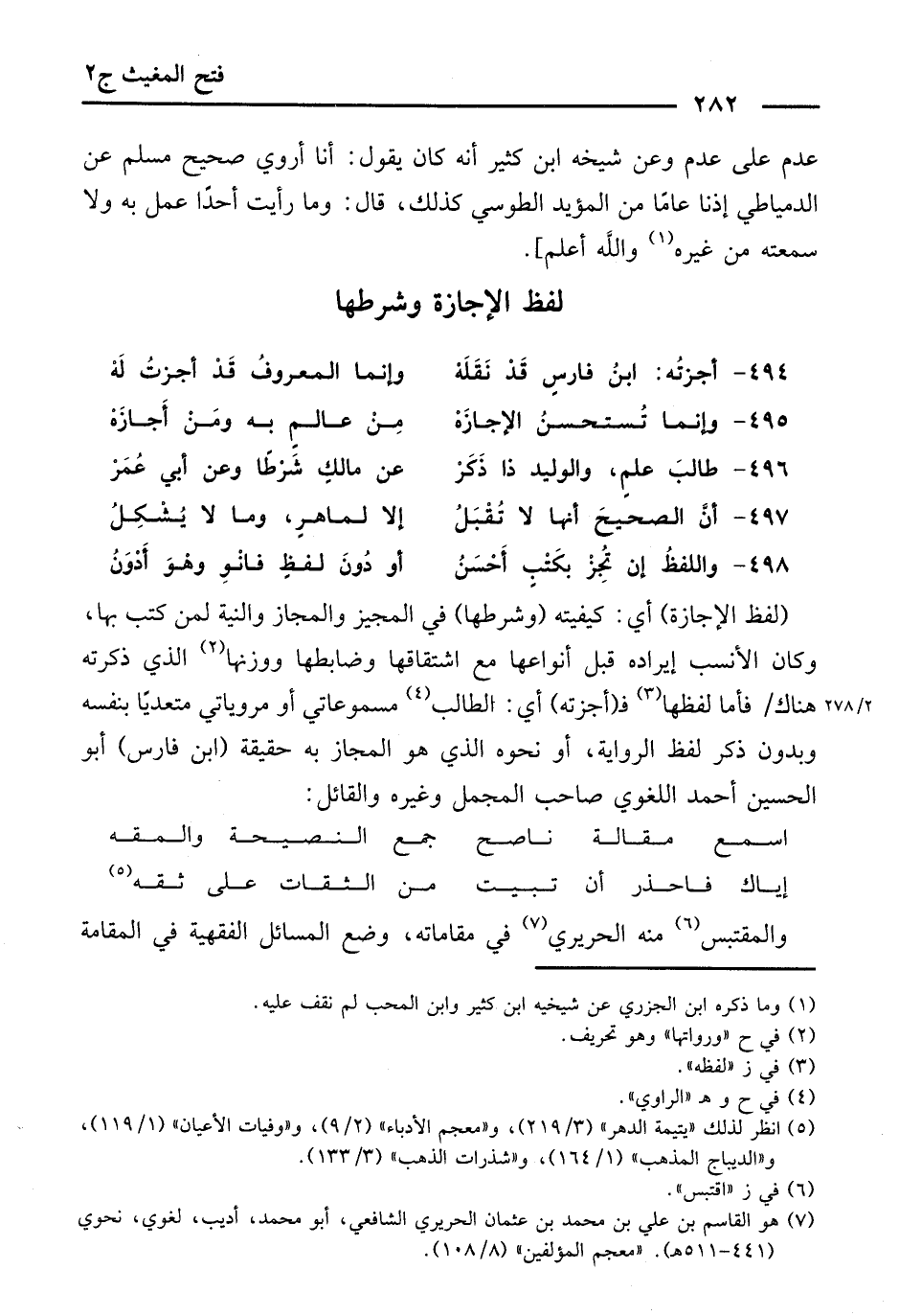 (لَفْظُ الْإِجَازَةِ) أَيْ: كَيْفِيَّتُهُ (وَشَرْطُهَا) فِي الْمُجِيزِ وَالْمُجَازِ وَالنِّيَّةِ لِمَنْ كَتَبَ بِهَا، وَكَانَ الْأَنْسَبُ إِيرَادَهُ قَبْلَ أَنْوَاعِهَا مَعَ اشْتِقَاقِهَا وَضَابِطِهَا وَوَزْنِهَا الَّذِي ذَكَرْتُهُ هُنَاكَ، فَأَمَّا لَفْظُهَا فَ (أَجَزْتُهُ) أَيِ: الطَّالِبَ، مَسْمُوعَاتِي أَوْ مَرْوِيَّاتِي، مَتَعَدِّيًا بِنَفْسِهِ وَبِدُونِ ذِكْرِ لَفْظِ الرِّوَايَةِ أَوْ نَحْوِهِ الَّذِي هُوَ الْمُجَازُ بِهِ حَقِيقَةً (ابْنُ فَارِسٍ) أَبُو الْحُسَيْنِ أَحْمَدُ اللُّغَوِيُّ صَاحِبُ (الْمُجْمَلِ) وَغَيْرُهُ، وَالْقَائِلُ: