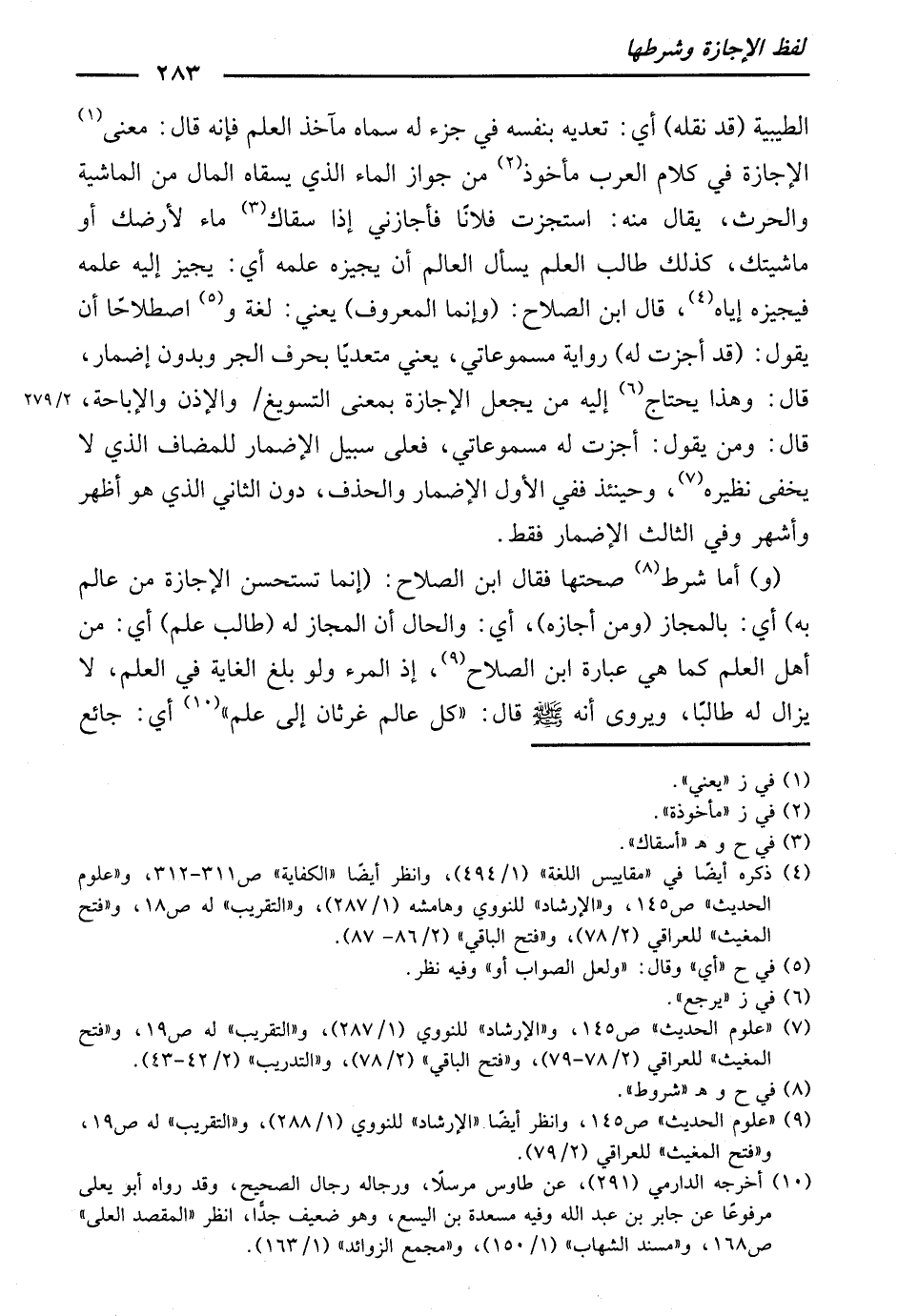 الطِّيبِيَّةِ (قَدْ نَقَلَهْ) أَيْ: تَعَدِّيَهُ بِنَفْسِهِ فِي جُزْءٍ لَهُ سَمَّاهُ: مَآخِذَ الْعِلْمِ ; فَإِنَّهُ قَالَ: مَعْنَى الْإِجَازَةِ فِي كَلَامِ الْعَرَبِ مَأْخُوذٌ مِنْ جَوَازِ الْمَاءِ الَّذِي يُسْقَاهُ الْمَالُ مِنَ الْمَاشِيَةِ وَالْحَرْثِ، يُقَالُ مِنْهُ: اسْتَجَزْتُ فُلَانًا فَأَجَازَنِي، إِذَا سَقَاكَ مَاءً لِأَرْضِكَ أَوْ مَاشِيَتِكَ، كَذَلِكَ طَالِبُ الْعِلْمِ يَسْأَلُ الْعَالِمَ أَنْ يُجِيزَهُ عِلْمَهُ ; أَيْ: يُجِيزُ إِلَيْهِ عِلْمَهُ، فَيُجِيزُهُ إِيَّاهُ، قَالَ ابْنُ الصَّلَاحِ: (وَإِنَّمَا الْمَعْرُوفُ) يَعْنِي: لُغَةً وَاصْطِلَاحًا، أَنْ يَقُولُ: (قَدْ أَجَزْتُ لَهْ) رِوَايَةَ مَسْمُوعَاتِي، يَعْنِي مَتَعَدِّيًا بِحَرْفِ الْجَرِّ وَبِدُونِ إِضْمَارٍ، قَالَ: وَهَذَا يَحْتَاجُ إِلَيْهِ مَنْ يَجْعَلُ الْإِجَازَةَ بِمَعْنَى التَّسْوِيغِ وَالْإِذْنِ وَالْإِبَاحَةِ، قَالَ: وَمَنْ يَقُولُ: أَجَزْتُ لَهُ مَسْمُوعَاتٍ، فَعَلَى سَبِيلِ الْإِضْمَارِ لِلْمُضَافِ الَّذِي لَا يَخْفَى نَظِيرُهُ، وَحِينَئِذٍ فَفِي الْأَوَّلِ الْإِضْمَارُ وَالْحَذْفُ دُونَ الثَّانِي الَّذِي هُوَ أَظْهَرُ وَأَشْهَرُ، وَفِي الثَّالِثِ الْإِضْمَارُ فَقَطْ.