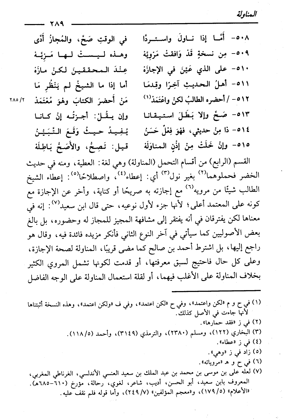 (الرَّابِعُ) مِنْ أَقْسَامِ التَّحَمُّلِ: (الْمُنَاوَلَةُ) ، وَهِيَ لُغَةً: الْعَطِيَّةُ، وَمِنْهُ فِي حَدِيثِ الْخَضِرِ: (( «فَحَمَلُوهُمَا بِغَيْرٍ نَوْلٍ» )) أَيْ: إِعْطَاءٍ، وَاصْطِلَاحًا: إِعْطَاءُ الشَّيْخِ الطَّالِبَ شَيْئًا مِنْ مَرْوِيِّهِ مَعَ إِجَازَتِهِ بِهِ صَرِيحًا أَوْ كِنَايَةً.