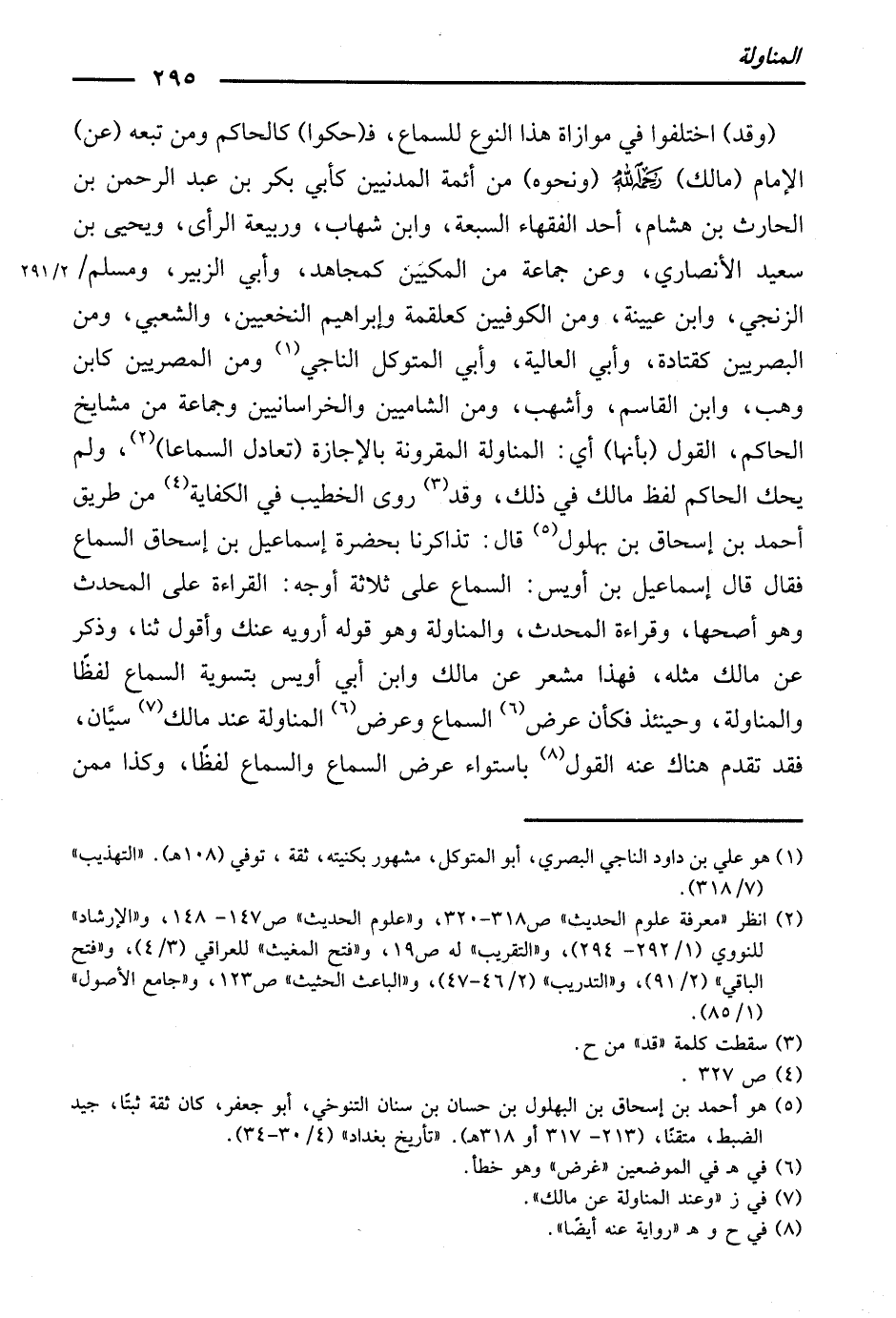 (وَقَدِ) اخْتَلَفُوا فِي مُوَازَاةِ هَذَا النَّوْعِ لِلسَّمَاعِ، فَ (حَكَوْا) كَالْحَاكِمِ وَمَنْ تَبِعَهُ (عَنْ) الْإِمَامِ (مَالِكٍ) رَحِمَهُ اللَّهُ (وَنَحْوِهِ) مِنْ أَئِمَّةِ الْمَدَنِيِّينَ ; كَأَبِي بَكْرِ بْنِ عَبْدِ الرَّحْمَنِ بْنِ الْحَارِثِ بْنِ هِشَامٍ، أَحَدِ الْفُقَهَاءِ السَّبْعَةِ، وَابْنِ شِهَابٍ، وَرَبِيعَةِ الرَّأْيِ، وَيَحْيَى بْنِ سَعِيدٍ الْأَنْصَارِيِّ، وَعَنْ جَمَاعَةٍ مِنَ الْمَكِّيِّينَ ; كَمُجَاهِدٍ، وَأَبِي الزُّبَيْرِ، وَمُسْلِمٍ الزَّنْجِيِّ، وَابْنِ عُيَيْنَةَ، وَمِنِ الْكُوفِيِّينَ كَعَلْقَمَةَ، وَإِبْرَاهِيمَ النَّخَعِيَّيْنِ، وَالشَّعْبِيِّ، وَمِنِ الْبَصْرِيِّينَ كَقَتَادَةَ، وَأَبِي الْعَالِيَةِ، وَأَبِي الْمُتَوَكِّلِ النَّاجِيِّ، وَمِنِ الْمِصْرِيِّينَ ; كَابْنِ وَهْبٍ، وَابْنِ الْقَاسِمِ، وَأَشْهَبَ، وَمِنِ الشَّامِيِّينَ وَالْخُرَاسَانِيِّينَ وَجَمَاعَةٍ مِنْ مَشَايِخَ الْحَاكِمِ، الْقَوْلَ (بِأَنَّهَا) أَيِ: الْمُنَاوَلَةَ الْمَقْرُونَةَ بِالْإِجَازَةِ (تُعَادِلُ السَّمَاعَا) ، وَلَمْ يَحْكِ الْحَاكِمُ لَفْظَ مَالِكٍ فِي ذَلِكَ، وَقَدْ رَوَى الْخَطِيبُ فِي الْكِفَايَةِ مِنْ طَرِيقِ أَحْمَدَ بْنِ إِسْحَاقَ بْنِ بُهْلُولٍ قَالَ: تَذَاكَرْنَا بِحَضْرَةِ إِسْمَاعِيلَ بْنِ إِسْحَاقَ السَّمَاعَ، فَقَالَ: قَالَ إِسْمَاعِيلُ بْنُ أُوَيْسٍ: السَّمَاعُ عَلَى ثَلَاثَةِ أَوْجُهٍ: الْقِرَاءَةُ عَلَى الْمُحَدِّثِ، وَهُوَ أَصَحُّهَا، وَقِرَاءَةُ الْمُحَدِّثِ، وَالْمُنَاوَلَةُ، وَهُوَ قَوْلُهُ: أَرْوِيهِ عَنْكَ وَأَقُولُ: ثَنَا، وَذُكِرَ عَنْ مَالِكٍ مِثْلُهُ، فَهَذَا مُشْعِرٌ عَنْ مَالِكٍ وَابْنِ أَبِي أُوَيْسٍ بِتَسْوِيَةِ السَّمَاعِ لَفْظًا وَالْمُنَاوَلَةِ، وَحِينَئِذٍ فَكَأَنَّ عَرْضَ السَّمَاعِ وَعَرْضَ الْمُنَاوَلَةِ عِنْدَ مَالِكٍ سِيَّانِ، فَقَدْ تَقَدَّمَ هُنَاكَ عَنْهُ الْقَوْلُ بِاسْتِوَاءِ عَرْضِ السَّمَاعِ وَالسَّمَاعِ لَفْظًا، وَكَذَا مِمَّنْ