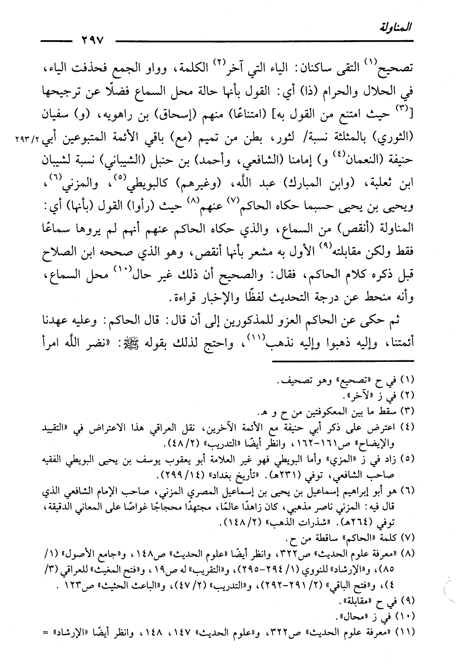 تَصْحِيحٍ الْتَقَى سَاكِنَانِ: الْيَاءُ الَّتِي آخِرَ الْكَلِمَةِ، وَوَاوُ الْجَمْعِ، فَحُذِفَتِ الْيَاءُ، فِي الْحَلَالِ وَالْحَرَامِ (ذَا) أَيِ: الْقَوْلَ بِأَنَّهَا حَالَّةٌ مَحَلَّ السَّمَاعِ، فَضْلًا عَنْ تَرْجِيحِهَا، [حَيْثُ امْتَنَعَ مِنَ الْقَوْلِ بِهِ] (امْتِنَاعًا) ، مِنْهُمْ (إِسْحَاقُ) بْنُ رَاهَوَيْهِ (وَ) سُفْيَانُ (الثَّوْرِيِّ) بِالْمُثَلَّثَةِ نِسْبَةً لِثَوْرٍ، بَطْنٍ مِنْ تَمِيمٍ (مَعَ) بَاقِي الْأَئِمَّةِ الْمَتْبُوعِينَ: أَبِي حَنِيفَةَ (النُّعْمَانِ وَ) إِمَامِنَا (الشَّافِعِيِّ وَأَحْمَدَ) بْنِ حَنْبَلٍ (الشَّيْبَانِيِّ) ، نِسْبَةً لِشَيْبَانَ بْنِ ثَعْلَبَةَ (وَابْنِ الْمُبَارَكِ) عَبْدِ اللَّهِ (وَغَيْرِهِمْ) كَالْبُوَيْطِيِّ، وَالْمُزَنِيِّ، وَيَحْيَى بْنِ يَحْيَى حَسْبَمَا حَكَاهُ الْحَاكِمُ عَنْهُمْ، حَيْثُ (رَأَوْا) الْقَوْلَ (بِأَنَّهَا) أَيِ: الْمُنَاوَلَةَ (أَنْقَصُ) مِنَ السَّمَاعِ. وَالَّذِي حَكَاهُ الْحَاكِمُ عَنْهُمْ أَنَّهُمْ لَمْ يَرَوُهَا سَمَاعًا فَقَطْ، وَلَكُنَّ مُقَابَلَتَهَ الْأَوَّلَ بِهِ مُشْعِرٌ بِأَنَّهَا أَنْقَصُ، وَهُوَ الَّذِي صَحَّحَهُ ابْنُ الصَّلَاحِ قَبْلَ ذِكْرِهِ كَلَامَ الْحَاكِمِ فَقَالَ: وَالصَّحِيحُ أَنَّ ذَلِكَ غَيْرُ حَالٍّ مَحَلَّ السَّمَاعِ، وَأَنَّهُ مُنْحَطٌّ عَنْ دَرَجَةِ التَّحْدِيثِ لَفْظًا، وَالْإِخْبَارِ قِرَاءَةً.