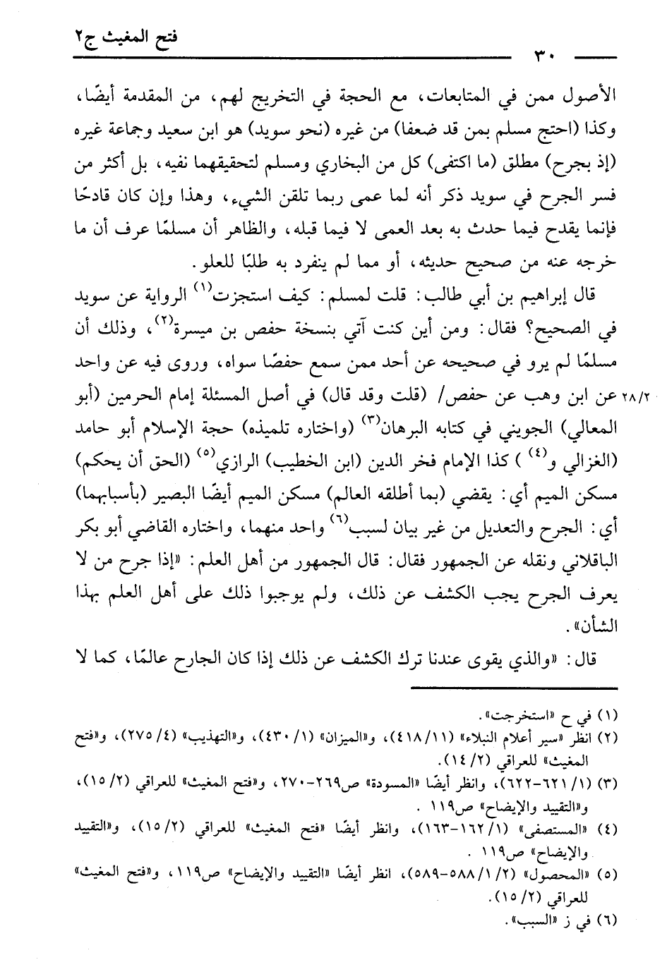 قَالَ إِبْرَاهِيمُ بْنُ أَبِي طَالِبٍ: قُلْتُ لِمُسْلِمٍ: كَيْفَ اسْتَجَزْتَ الرِّوَايَةَ عَنْ سُوَيْدٍ فِي الصَّحِيحِ؟ فَقَالَ: وَمِنْ أَيْنَ كُنْتُ آتِي بِنُسْخَةِ حَفْصِ بْنِ مَيْسَرَةَ، وَذَلِكَ أَنَّ مُسْلِمًا لَمْ يَرْوِ فِي صَحِيحِهِ عَنْ أَحَدٍ مِمَّنْ سَمِعَ حَفْصًا سِوَاهُ، وَرَوَى فِيهِ عَنْ وَاحِدٍ عَنِ ابْنِ وَهْبٍ عَنْ حَفْصٍ. (قُلْتُ وَقَدْ قَالَ) فِي أَصْلِ الْمَسْأَلَةِ إِمَامُ الْحَرَمَيْنِ (أَبُو الْمَعَالِي) الْجُوَيْنِيُّ فِي كِتَابِهِ (الْبُرْهَانِ) (وَاخْتَارَهُ تِلْمِيذُهُ) حُجَّةُ الْإِسْلَامِ أَبُو حَامِدٍ (الْغَزَّالِيُّ وَ) كَذَا الْإِمَامُ فَخْرُ الدِّينِ (ابْنُ الْخَطِيبِ) الرَّازِيُّ (الْحَقُّ أَنْ يُحْكَمْ) مُسَكَّنُ الْمِيمِ ; أَيْ: يُقْضَى (بِمَا أَطْلَقَهُ الْعَالِمْ) مُسَكَّنُ الْمِيمِ أَيْضًا، الْبَصِيرُ (بِأَسْبَابِهِمَا) أَيِ: الْجَرْحِ وَالتَّعْدِيلِ، مِنْ غَيْرِ بَيَانٍ لِسَبَبٍ وَاحِدٍ مِنْهُمَا، وَاخْتَارَهُ الْقَاضِي أَبُو بَكْرٍ الْبَاقِلَّانِيُّ وَنَقَلَهُ عَنِ الْجُمْهُورِ، فَقَالَ: قَالَ الْجُمْهُورُ مِنْ أَهْلِ الْعِلْمِ: " إِذَا جَرَّحَ مَنْ لَا يَعْرِفُ الْجَرْحَ يَجِبُ الْكَشْفُ عَنْ ذَلِكَ، وَلَمْ يُوجِبُوا ذَلِكَ عَلَى أَهْلِ الْعِلْمِ بِهَذَا الشَّأْنِ ".