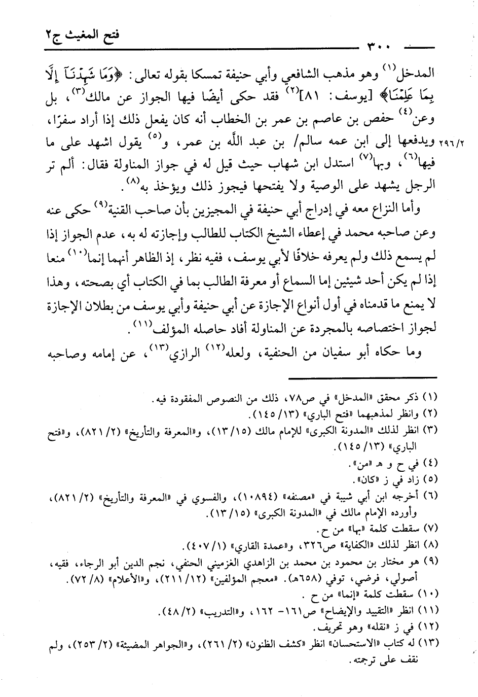 (الْمَدْخَلِ) ، وَهُوَ مَذْهَبُ الشَّافِعِيِّ وَأَبِي حَنِيفَةَ تَمَسُّكًا بِقَوْلِهِ تَعَالَى: {وَمَا شَهِدْنَا إِلَّا بِمَا عَلِمْنَا} [يُوسُفَ: 81] فَقَدْ حُكِيَ أَيْضًا فِيهَا الْجَوَازُ عَنْ مَالِكٍ، بَلْ وَعَنْ حَفْصِ بْنِ عَاصِمِ بْنِ عُمَرَ بْنِ الْخَطَّابِ أَنَّهُ كَانَ يَفْعَلُ ذَلِكَ إِذَا أَرَادَ سَفَرًا، وَيَدْفَعُهَا إِلَى ابْنِ عَمِّهِ سَالِمِ بْنِ عَبْدِ اللَّهِ بْنِ عُمَرَ، وَيَقُولُ: اشْهَدْ عَلَى مَا فِيهَا، وَبِهَا اسْتَدَلَّ ابْنُ شِهَابٍ، حَيْثُ قِيلَ لَهُ فِي جَوَازِ الْمُنَاوَلَةِ، فَقَالَ: أَلَمْ تَرَ الرَّجُلَ يَشْهَدُ عَلَى الْوَصِيَّةِ وَلَا يَفْتَحُهَا؟ فَيَجُوزُ ذَلِكَ وَيُؤْخَذُ بِهِ.