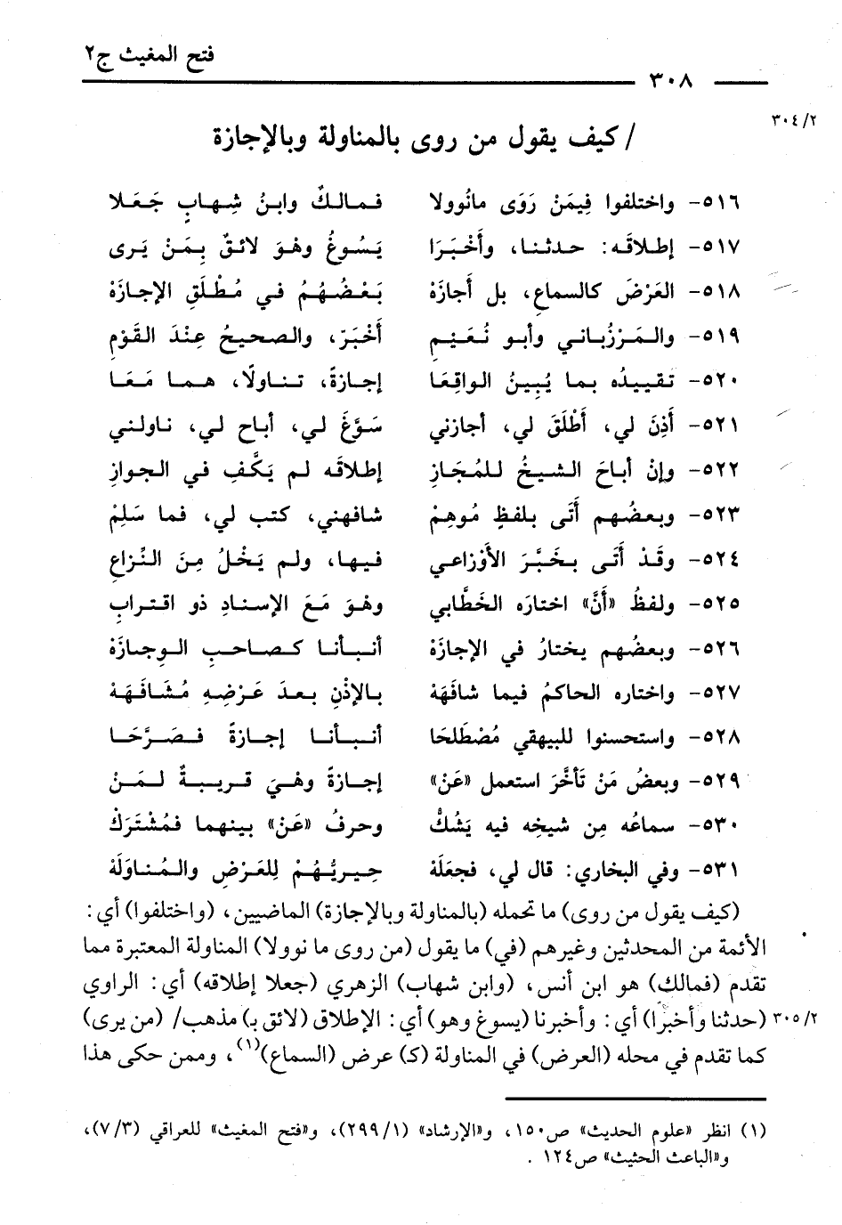 518 - الْعَرْضَ كَالسَّمَاعِ بَلْ أَجَازَهْ ... بَعْضُهُمُ فِي مُطْلَقِ الْإِجَازَهْ