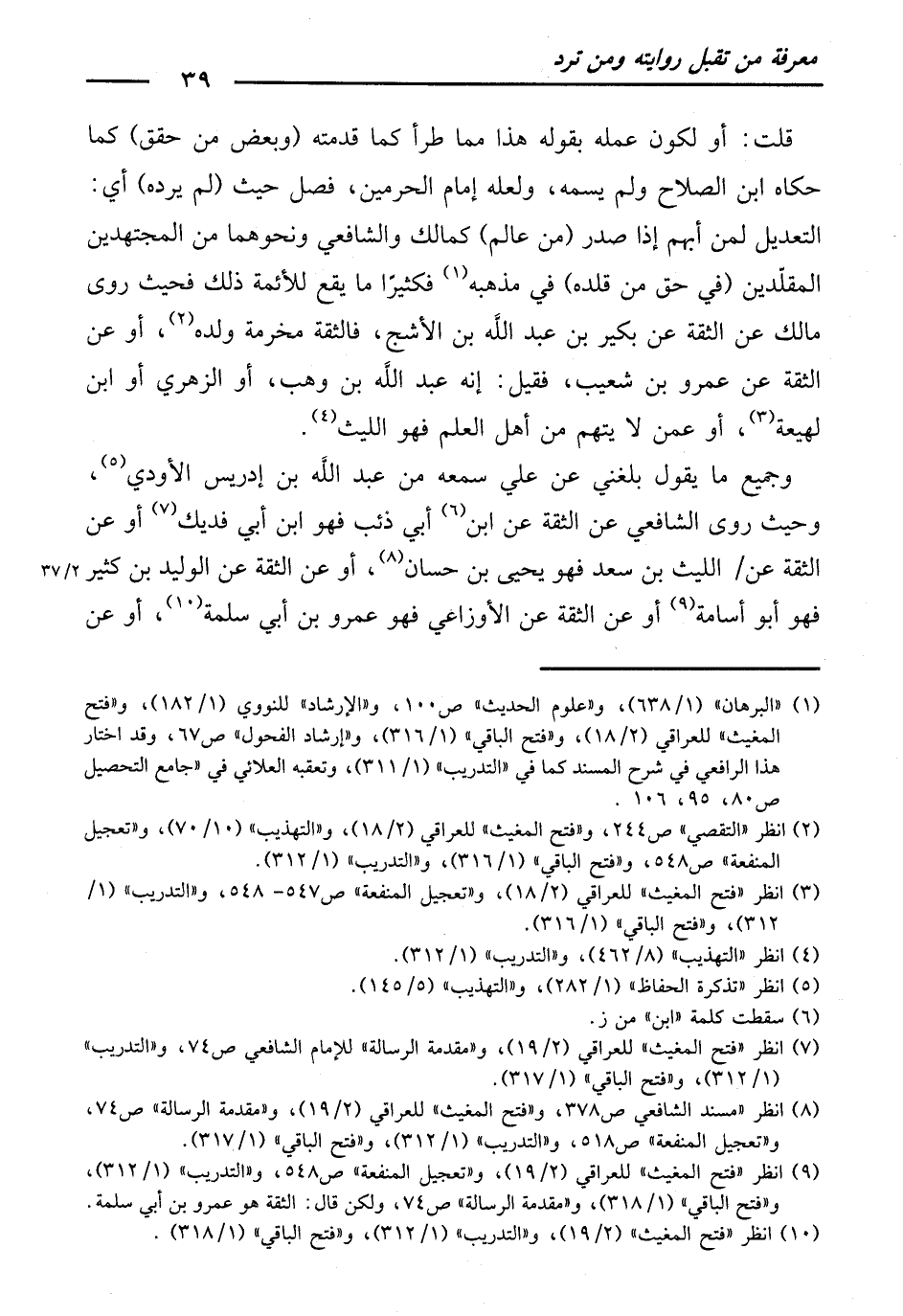 قُلْتُ: أَوْ لِكَوْنِ عَمَلِهِ بِقَوْلِهِ هَذَا مِمَّا طَرَأَ كَمَا قَدَّمْتُهُ (وَبَعْضُ مَنْ حَقَّقَ) كَمَا حَكَاهُ ابْنُ الصَّلَاحِ وَلَمْ يُسَمِّهِ، وَلَعَلَّهُ إِمَامُ الْحَرَمَيْنِ، فَصَّلَ حَيْثُ (لَمْ يَرُدَّهُ) أَيِ: التَّعْدِيلَ لِمَنْ أُبْهِمَ إِذَا صَدَرَ (مِنْ عَالِمٍ) كَمَالِكٍ وَالشَّافِعِيِّ وَنَحْوِهِمَا مِنَ الْمُجْتَهِدِينَ الْمُقَلِّدِينَ (فِي حَقِّ مَنْ قَلَّدَهُ) فِي مَذْهَبِهِ، فَكَثِيرًا مَا يَقَعُ لِلْأَئِمَّةِ ذَلِكَ، فَحَيْثُ رَوَى مَالِكٌ عَنِ الثِّقَةِ عَنْ بُكَيْرِ بْنِ عَبْدِ اللَّهِ بْنِ الْأَشَجِّ، فَالثِّقَةُ مَخْرَمَةُ وَلَدُهُ، أَوْ عَنِ الثِّقَةِ عَنْ عَمْرِو بْنِ شُعَيْبٍ، فَقِيلَ: إِنَّهُ عَبْدُ اللَّهِ بْنُ وَهْبٍ، أَوِ الزُّهْرِيُّ، أَوِ ابْنُ لَهِيعَةَ، أَوْ عَمَّنْ لَا يُتَّهَمُ مِنْ أَهْلِ الْعِلْمِ، فَهُوَ اللَّيْثُ.