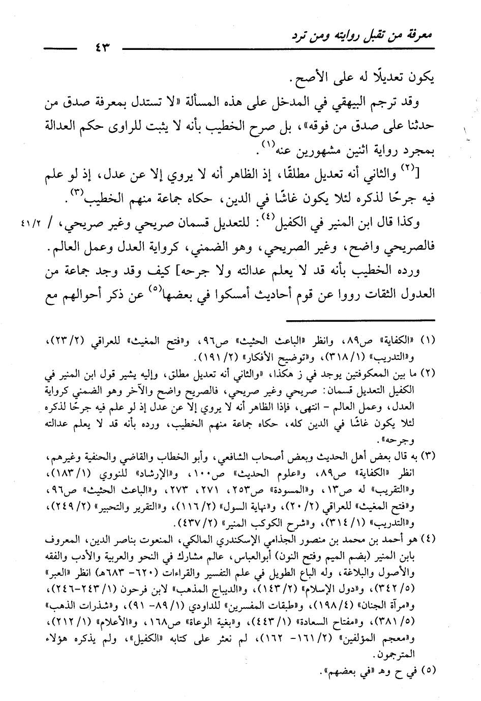 وَرَدَّهُ الْخَطِيبُ بِأَنَّهُ قَدْ لَا يُعْلَمُ عَدَالَتُهُ وَلَا جَرْحُهُ] ، كَيْفَ وَقَدْ وُجِدَ جَمَاعَةٌ مِنَ الْعُدُولِ الثِّقَاتِ رَوَوْا عَنْ قَوْمٍ أَحَادِيثَ أَمْسَكُوا فِي بَعْضِهَا عَنْ ذِكْرِ أَحْوَالِهِمْ مَعَ