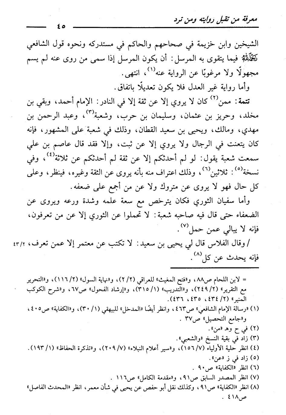 وَأَمَّا سُفْيَانُ الثَّوْرِيُّ فَكَانَ يَتَرَخَّصُ مَعَ سَعَةِ عِلْمِهِ وَشِدَّةِ وَرَعِهِ وَيَرْوِي عَنِ الضُّعَفَاءِ، حَتَّى قَالَ فِيهِ صَاحِبُهُ شُعْبَةُ: لَا تَحْمِلُوا عَنِ الثَّوْرِيِّ إِلَّا عَمَّنْ تَعْرِفُونَ ; فَإِنَّهُ لَا يُبَالِي عَمَّنْ حَمَلَ.