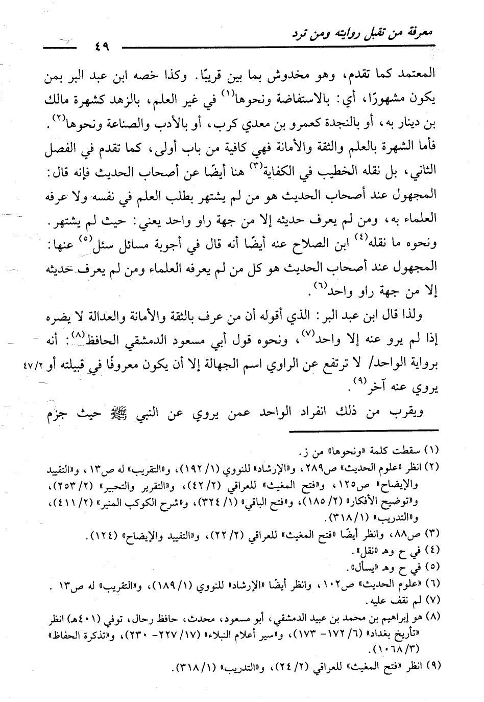 الْمُعْتَمَدِ كَمَا تَقَدَّمَ، وَهُوَ مَخْدُوشٌ بِمَا بُيِّنَ قَرِيبًا، وَكَذَا خَصَّهُ ابْنُ عَبْدِ الْبَرِّ بِمَنْ يَكُونُ مَشْهُورًا، أَيْ بِالِاسْتِفَاضَةِ وَنَحْوِهَا فِي غَيْرِ الْعِلْمِ بِالزُّهْدِ كَشُهْرَةِ مَالِكِ بْنِ دِينَارٍ بِهِ، أَوْ بِالنَّجْدَةِ كَعَمْرِو بْنِ مَعْدِي كَرِبَ، أَوْ بِالْأَدَبِ وَالصِّنَاعَةِ وَنَحْوِهَا.