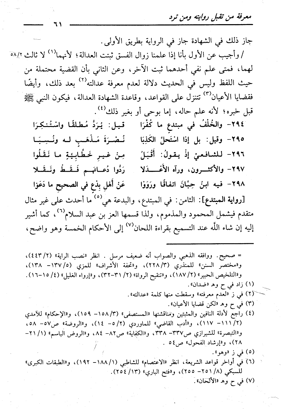 [رِوَايَةُ الْمُبْتَدِعِ] : الثَّامِنُ: فِي الْمُبْتَدِعِ، وَالْبِدْعَةُ هِيَ مَا أُحْدِثَ عَلَى غَيْرِ مِثَالٍ مُتَقَدِّمٍ، فَيَشْمَلُ الْمَحْمُودَ وَالْمَذْمُومَ، وَلِذَا قَسَّمَهَا الْعِزُّ بْنُ عَبْدِ السَّلَامِ، كَمَا أُشِيرُ إِلَيْهِ إِنْ شَاءَ اللَّهُ عِنْدَ التَّسْمِيعِ بِقِرَاءَةِ اللُّحَّانِ، إِلَى الْأَحْكَامِ الْخَمْسَةِ، وَهُوَ وَاضِحٌ،