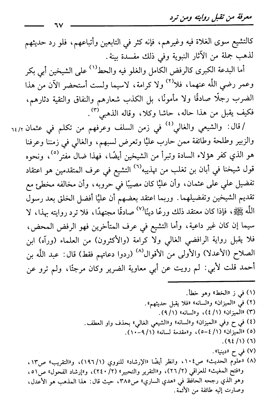 قَالَ: وَالشِّيعِيُّ وَالْغَالِي فِي زَمَنِ السَّلَفِ وَعُرْفِهِمْ مَنْ تَكَلَّمَ فِي عُثْمَانَ وَالزُّبَيْرِ وَطَلْحَةَ وَطَائِفَةٍ مِمَّنْ حَارَبَ عَلِيًّا، وَتَعَرَّضَ لِسَبِّهِمْ. وَالْغَالِي فِي زَمَنِنَا وَعُرْفِنَا هُوَ الَّذِي كَفَّرَ هَؤُلَاءِ السَّادَةَ وَتَبَرَّأَ مِنَ الشَّيْخَيْنِ أَيْضًا، فَهَذَا ضَالٌّ مُفْتَرٍ. وَنَحْوُهُ قَوْلُ شَيْخِنَا فِي أَبَانِ بْنِ تَغْلِبَ مِنْ تَهْذِيبِهِ: التَّشَيُّعُ فِي عُرْفِ الْمُتَقَدِّمِينَ هُوَ اعْتِقَادُ تَفْضِيلِ عَلِيٍّ عَلَى عُثْمَانَ، وَأَنَّ عَلِيًّا كَانَ مُصِيبًا فِي حُرُوبِهِ، وَأَنَّ مُخَالِفَهُ مُخْطِئٌ، مَعَ تَقْدِيمِ الشَّيْخَيْنِ وَتَفْضِيلِهِمَا، وَرُبَّمَا اعْتَقَدَ بَعْضُهُمْ أَنَّ عَلِيًّا أَفْضَلُ الْخَلْقِ بَعْدَ رَسُولِ اللَّهِ صَلَّى اللَّهُ عَلَيْهِ وَسَلَّمَ، فَإِذَا كَانَ مُعْتَقِدُ ذَلِكَ وَرِعًا دَيِّنًا صَادِقًا مُجْتَهِدًا فَلَا تُرَدُّ رِوَايَتُهُ بِهَذَا، لَا سِيَّمَا إِنْ كَانَ غَيْرَ دَاعِيَةٍ. وَأَمَّا التَّشَيُّعُ فِي عُرْفِ الْمُتَأَخِّرِينَ فَهُوَ الرَّفْضُ الْمَحْضُ، فَلَا يُقْبَلُ رِوَايَةُ الرَّافِضِيِّ الْغَالِي وَلَا كَرَامَةَ.