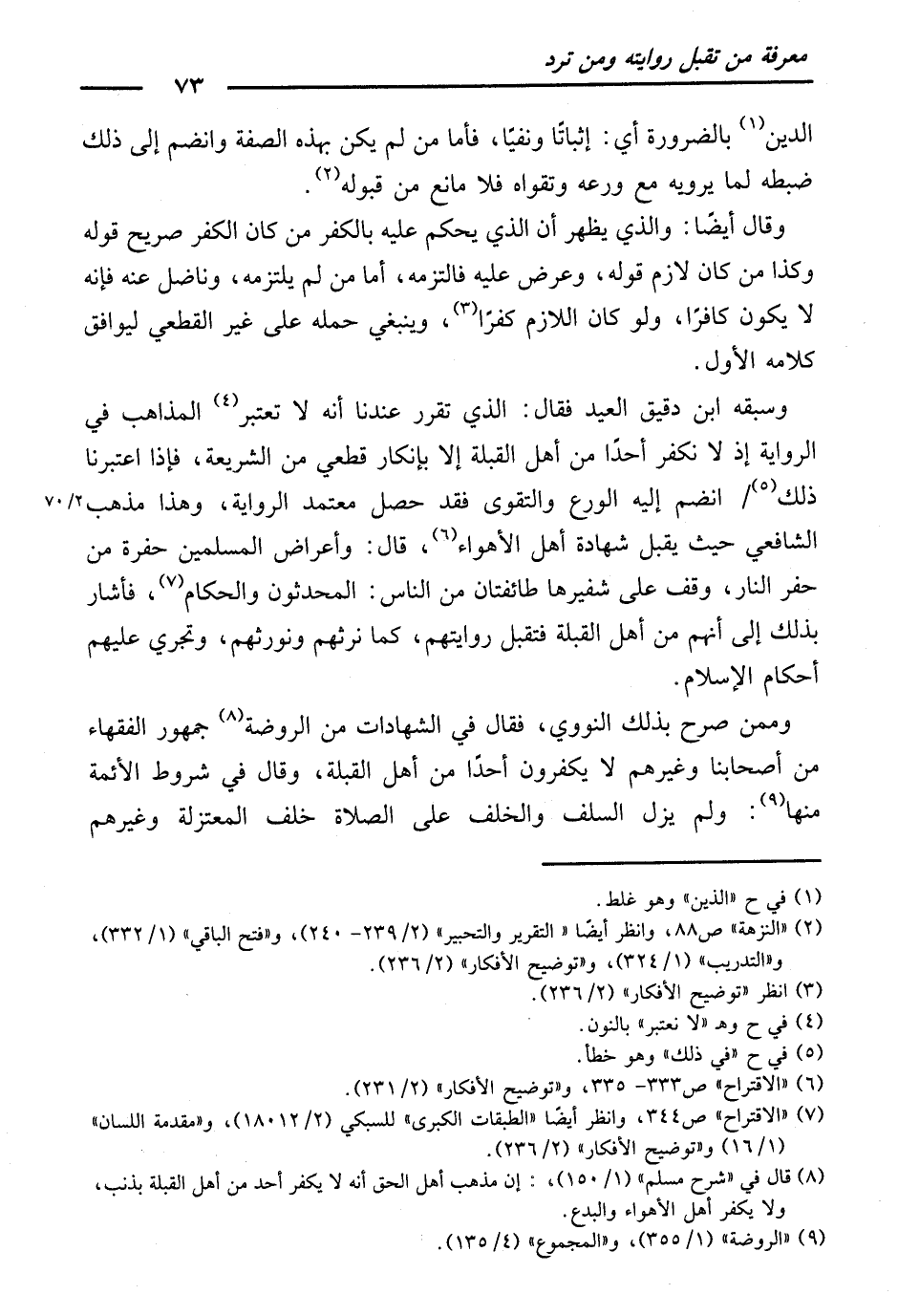الدِّينِ بِالضَّرُورَةِ ; أَيْ: إِثْبَاتًا وَنَفْيًا، فَأَمَّا مَنْ لَمْ يَكُنْ بِهَذِهِ الصِّفَةِ، وَانْضَمَّ إِلَى ذَلِكَ ضَبْطُهُ لِمَا يَرْوِيهِ مَعَ وَرَعِهِ وَتَقْوَاهُ، فَلَا مَانِعَ مِنْ قَبُولِهِ.