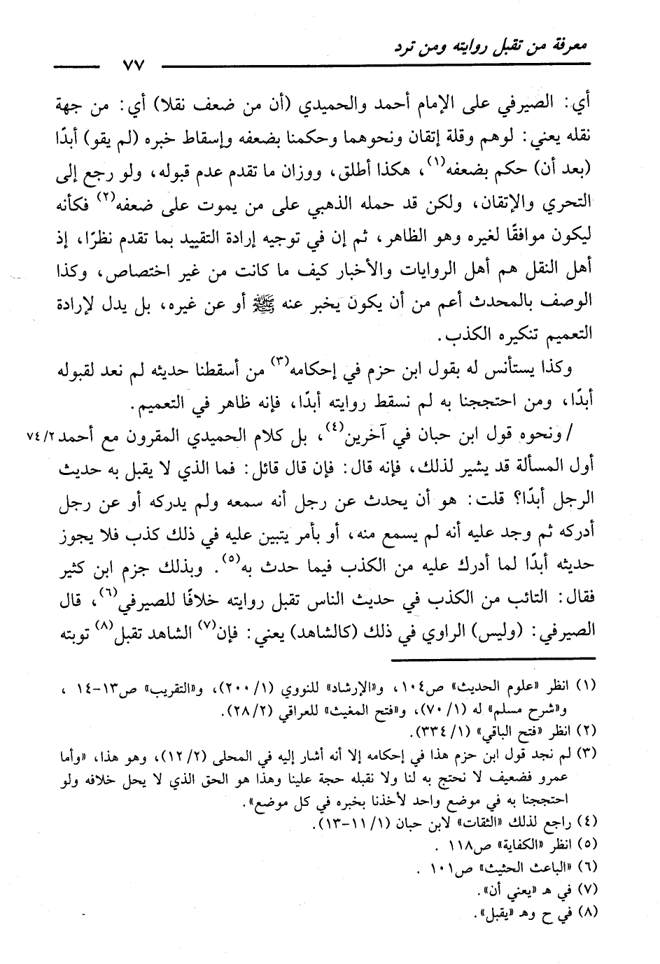 وَنَحْوُهُ قَوْلُ ابْنِ حِبَّانَ فِي آخَرِينَ، بَلْ كَلَامُ الْحُمَيْدِيِّ الْمَقْرُونِ مَعَ أَحْمَدَ أَوَّلَ الْمَسْأَلَةِ قَدْ يُشِيرُ لِذَلِكَ ; فَإِنَّهُ قَالَ: فَإِنْ قَالَ قَائِلٌ: فَمَا الَّذِي لَا يُقْبَلُ بِهِ حَدِيثُ الرَّجُلِ أَبَدًا؟ قُلْتُ: هُوَ أَنْ يُحَدِّثَ عَنْ رَجُلٍ أَنَّهُ سَمِعَهُ وَلَمْ يُدْرِكْهُ، أَوْ عَنْ رَجُلٍ أَدْرَكَهُ ثُمَّ وُجِدَ عَلَيْهِ أَنَّهُ لَمْ يَسْمَعْ مِنْهُ، أَوْ بِأَمْرٍ يَتَبَيَّنُ عَلَيْهِ فِي ذَلِكَ كَذِبٌ، فَلَا يَجُوزُ حَدِيثُهُ أَبَدًا لِمَا أُدْرِكَ عَلَيْهِ مِنَ الْكَذِبِ فِيمَا حَدَّثَ بِهِ.