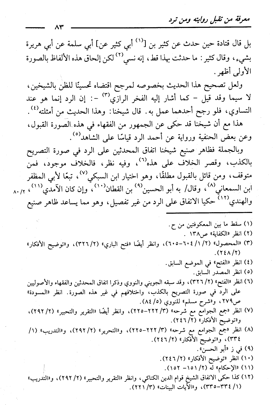 بَلْ قَالَ قَتَادَةُ حِينَ حَدَّثَ عَنْ كَثِيرِ بْنِ [أَبِي كَثِيرٍ عَنْ] أَبِي سَلَمَةَ عَنْ أَبِي هُرَيْرَةَ بِشَيْءٍ، وَقَالَ كَثِيرٌ: مَا حَدَّثْتُ بِهَذَا قَطُّ، إِنَّهُ نَسِيَ، لَكِنَّ إِلْحَاقَ هَذِهِ الْأَلْفَاظِ بِالصُّورَةِ الْأُولَى أَظْهَرُ.