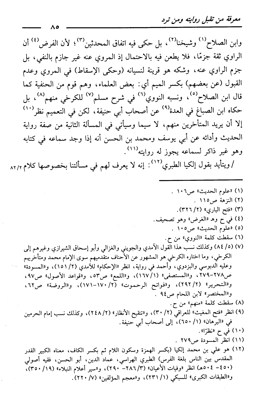 وَابْنُ الصَّلَاحِ وَشَيْخُنَا، بَلْ حَكَى فِيهِ اتِّفَاقَ الْمُحَدِّثِينَ ; لِأَنَّ الْفَرْضَ أَنَّ الرَّاوِيَ ثِقَةٌ جَزْمًا، فَلَا يُطْعَنُ فِيهِ بِالِاحْتِمَالِ ; إِذِ الْمَرْوِيُّ عَنْهُ غَيْرُ جَازِمٍ بِالنَّفْيِ، بَلْ جَزْمُ الرَّاوِي عَنْهُ وَشَكُّهُ هُوَ قَرِينَةٌ لِنِسْيَانِهِ (وَحُكِيَ الْإِسْقَاطُ) فِي الْمَرْوِيِّ وَعَدَمُ الْقَبُولِ (عَنْ بَعْضِهِمِ) بِكَسْرِ الْمِيمِ ; أَيْ: بَعْضِ الْعُلَمَاءِ، وَهُمْ قَوْمٌ مِنَ الْحَنَفِيَّةِ كَمَا قَالَ ابْنُ الصَّلَاحِ، وَنَسَبَهُ النَّوَوِيُّ فِي شَرْحِ مُسْلِمٍ لِلْكَرْخِيِّ مِنْهُمْ، بَلْ حَكَاهُ ابْنُ الصَّبَّاغِ فِي الْعُدَّةِ عَنْ أَصْحَابِ أَبِي حَنِيفَةَ، لَكِنْ فِي التَّعْمِيمِ نَظَرٌ، إِلَّا أَنْ يُرِيدَ الْمُتَأَخِّرِينَ مِنْهُمْ، لَا سِيَّمَا وَسَيَأْتِي فِي الْمَسْأَلَةِ الثَّانِيَةِ مِنْ صِفَةِ رِوَايَةِ الْحَدِيثِ وَأَدَائِهِ عَنْ أَبِي يُوسُفَ وَمُحَمَّدِ بْنِ الْحَسَنِ أَنَّهُ إِذَا وُجِدَ سَمَاعُهُ فِي كِتَابِهِ وَهُوَ غَيْرُ ذَاكِرٍ لِسَمَاعِهِ يَجُوزُ لَهُ رِوَايَتُهُ.
