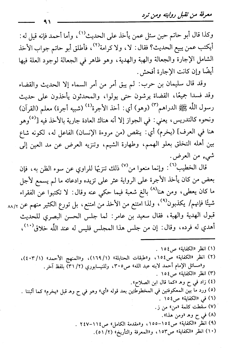 قَالَ الْخَطِيبُ: وَإِنَّمَا مَنَعُوا مِنْ ذَلِكَ تَنْزِيهًا لِلرَّاوِي عَنْ سُوءِ الظَّنِّ بِهِ ; فَإِنَّ بَعْضَ مَنْ كَانَ يَأْخُذُ الْأُجْرَةَ عَلَى الرِّوَايَةِ عُثِرَ عَلَى تَزَيُّدِهِ وَادِّعَائِهِ مَا لَمْ يَسْمَعْ لِأَجْلِ مَا كَانَ يُعْطَى، وَمِنْ هُنَا بَالَغَ شُعْبَةُ فِيمَا حُكِيَ عَنْهُ وَقَالَ: لَا تَكْتُبُوا عَنِ الْفُقَرَاءِ شَيْئًا ; فَإِنَّهُمْ يَكْذِبُونَ، وَلِذَا امْتَنَعَ مِنَ الْأَخْذِ مَنِ امْتَنَعَ، بَلْ تَوَرَّعَ الْكَثِيرُ مِنْهُمْ عَنْ قَبُولِ الْهَدِيَّةِ وَالْهِبَةِ، فَقَالَ سَعِيدُ بْنُ عَامِرٍ: لَمَّا جَلَسَ الْحَسَنُ الْبَصْرِيُّ لِلْحَدِيثِ أُهْدِيَ لَهُ، فَرَدَّهُ وَقَالَ: إِنَّ مَنْ جَلَسَ هَذَا الْمَجْلِسَ فَلَيْسَ لَهُ عِنْدَ اللَّهِ خَلَاقٌ،