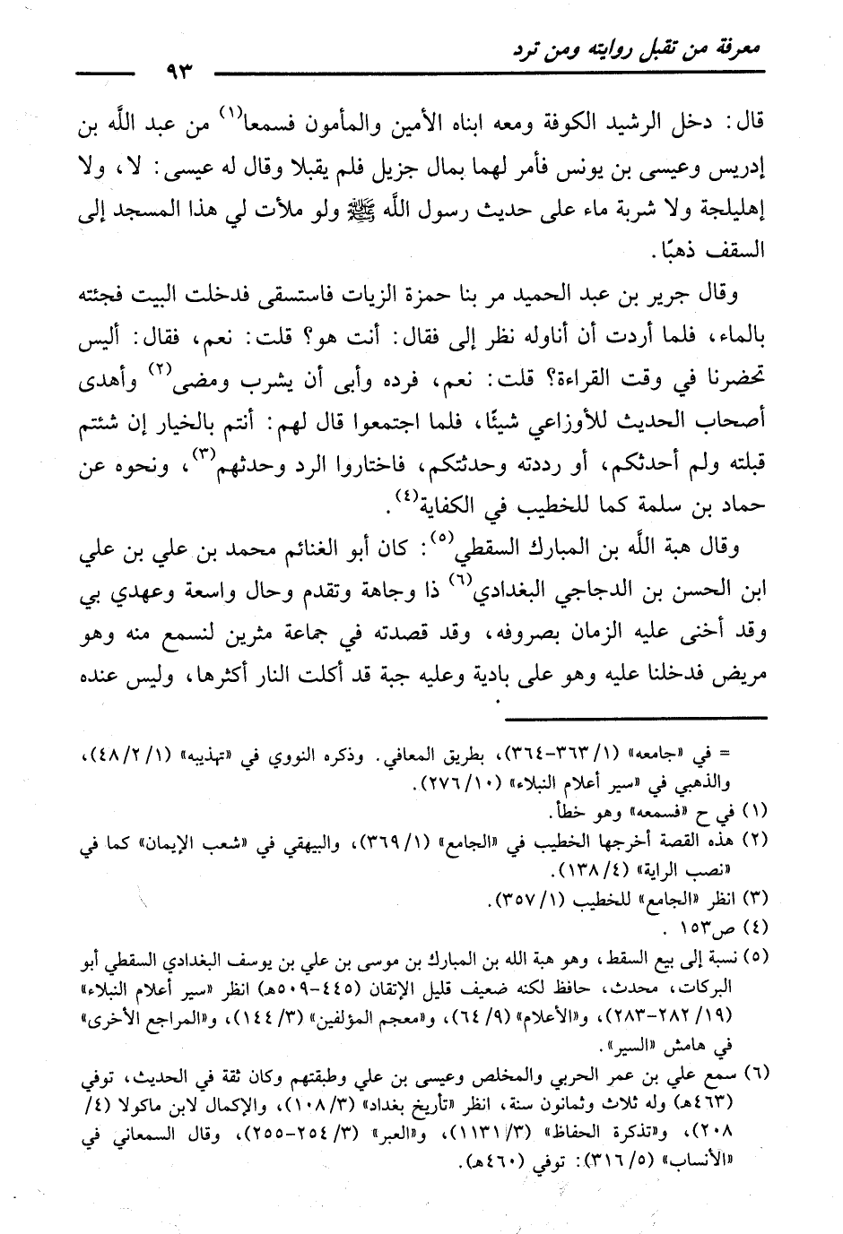 قَالَ: دَخَلَ الرَّشِيدُ الْكُوفَةَ، وَمَعَهُ ابْنَاهُ الْأَمِينُ وَالْمَأْمُونُ، فَسَمِعَا مِنْ عَبْدِ اللَّهِ بْنِ إِدْرِيسَ وَعِيسَى بْنِ يُونُسَ، فَأَمَرَ لَهُمَا بِمَالٍ جَزِيلٍ، فَلَمْ يَقْبَلَا، وَقَالَ لَهُ عِيسَى: لَا، وَلَا إِهْلِيلِجَةَ، وَلَا شَرْبَةَ مَاءٍ عَلَى حَدِيثِ رَسُولِ اللَّهِ صَلَّى اللَّهُ عَلَيْهِ وَسَلَّمَ، وَلَوْ مَلَأْتَ لِي هَذَا الْمَسْجِدَ إِلَى السَّقْفِ ذَهَبًا.