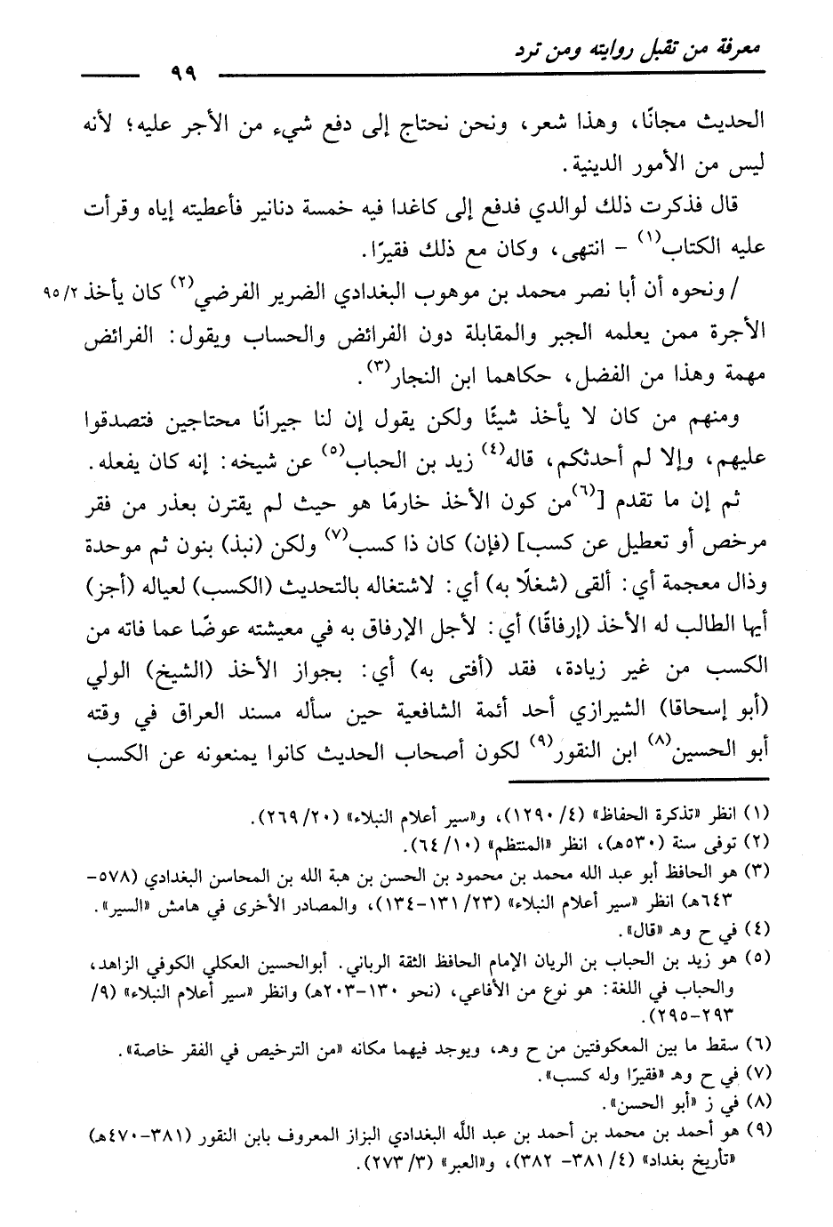 وَمِنْهُمْ مَنْ كَانَ لَا يَأْخُذُ شَيْئًا، وَلَكِنْ يَقُولُ: إِنَّ لَنَا جِيرَانًا مُحْتَاجِينَ، فَتَصَدَّقُوا عَلَيْهِمْ، وَإِلَّا لَمْ أُحَدِّثْكُمْ، قَالَهُ زَيْدُ بْنُ الْحُبَابِ عَنْ شَيْخِهِ: إِنَّهُ كَانَ يَفْعَلُهُ.