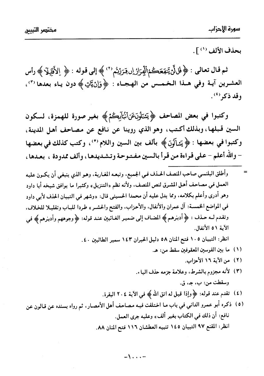 - والله أعلم- على قراءة من قرأ بالسين مفتوحة وتشديدها، وألف ممدودة، بعدها،- وأطلق البلنسي صاحب المنصف الحذف في الجميع، وتبعه المغاربة، وهو الذي ينبغي أن يكون عليه العمل في مصاحف أهل المشرق لنص المنصف، ولأنه نظم «التنزيل» وكثيرا ما يوافق شيخه أبا داود وهو أدرى وأعلم بكلامه، ومما يدل عليه أن محمدا الحسينى قال: «وشهر في التبيان الحذف لأبي داود في المواضع الخمسة: آل عمران والأنفال، والأحزاب، والفتح والحشر» طردا للباب وتقليلا للخلاف، وتقدم له حذف: أدبرهم المضاف إلى ضمير الغائبين عند قوله: وجوههم وأدبرهم في الآية 51 الأنفال.