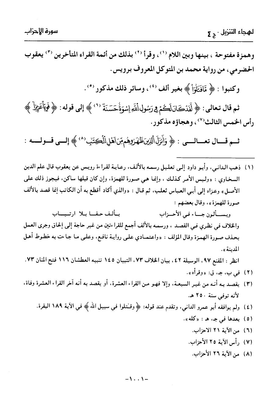 ويسألون جاء في الأحزاب* بألف حقا بلا ارتياب والخلاف في نظري في القصد، ورسمه بالألف أجمع للقراءتين من غير حاجة إلى إلحاق وجرى العمل بحذف صورة الهمزة وقال المؤلف: «واعتمادي على رواية نافع، وعلى ما جاءت به خطوط أهل المدينة».