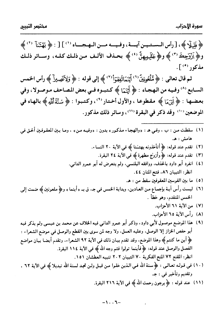 ثم قال تعالى: مّلعونين (¬6) أينما ثففوا (¬7) إلى قوله: ولا نصيرا رأس الخمس السابع (¬8) وفيه من الهجاء: أينما كتبوه في بعض المصاحف موصولا، وفي بعضها: أين ما مقطوعا، والأول أختار (¬9)، وكتبوا: سنّة الله بالهاء في الموضعين (¬10) وقد ذكر في البقرة (¬11)، وسائر ذلك مذكور.
