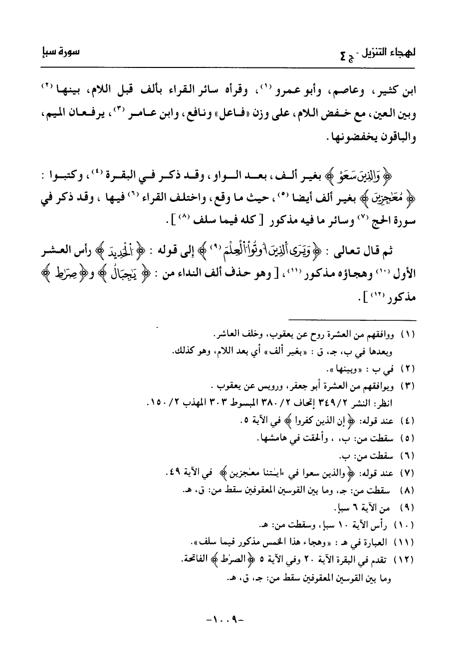 ثم قال تعالى: ويرى الذين أوتوا العلم (¬9) إلى قوله: الحديد رأس العشر الأول (¬10) وهجاؤه مذكور (¬11)، [وهو حذف ألف النداء من: يجبال وصراط مذكور (¬12)].
