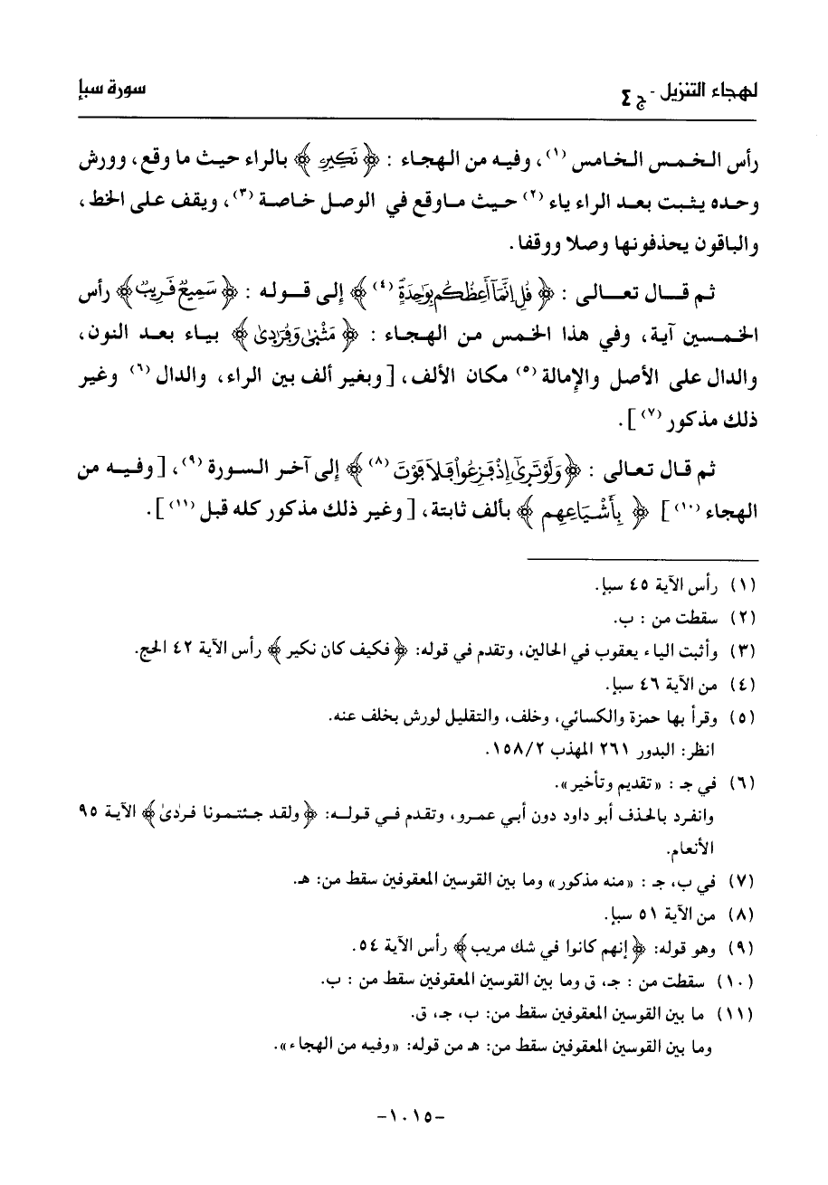 ثم قال تعالى: قل انّما أعظكم بوحدة (¬4) إلى قوله: سميع قريب رأس الخمسين آية، وفي هذا الخمس من الهجاء: مثنى وفردى بياء بعد النون، والدال على الأصل والإمالة (¬5) مكان الألف، [وبغير ألف بين الراء، والدال (¬6) وغير ذلك مذكور (¬7)].