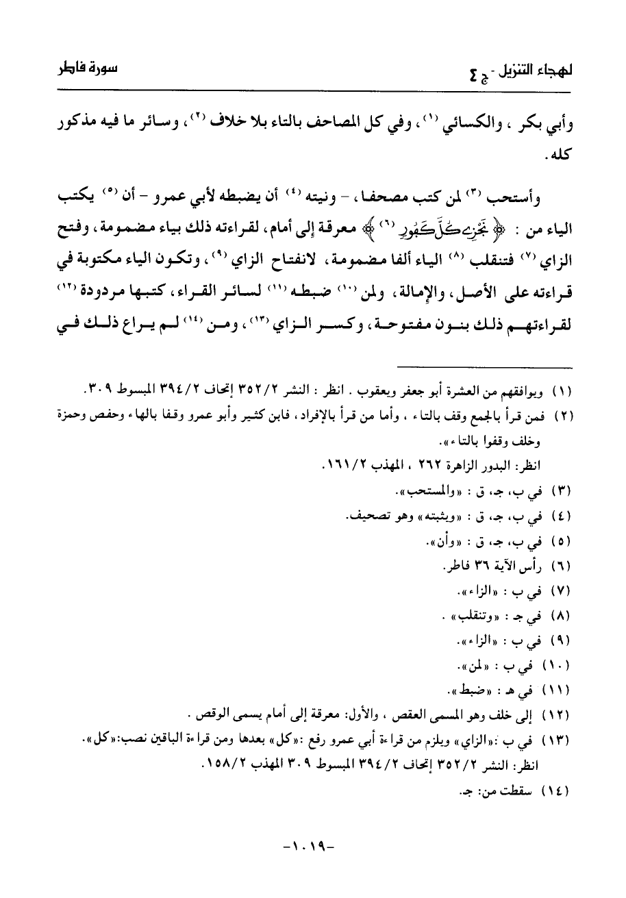 وأستحب (¬3) لمن كتب مصحفا،- ونيته (¬4) أن يضبطه لأبي عمرو- أن (¬5) يكتب الياء من: نجزى كلّ كفور (¬6) معرقة إلى أمام، لقراءته ذلك بياء مضمومة، وفتح الزاي (¬7) فتنقلب (¬8) الياء ألفا مضمومة، لانفتاح الزاي (¬9)، وتكون الياء مكتوبة في قراءته على الأصل، والإمالة، ولمن (¬10) ضبطه (¬11) لسائر القراء، كتبها مردودة (¬12) لقراءتهم ذلك بنون مفتوحة، وكسر الزاي (¬13)، ومن (¬14) لم يراع ذلك في
