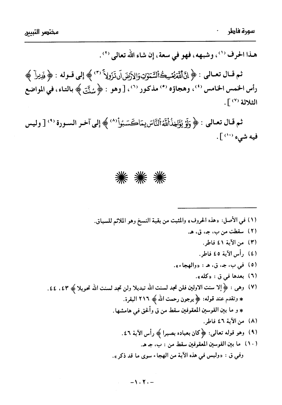 ثم قال تعالى: انّ الله يمسك السّموت والارض أن تزولا (¬3) إلى قوله: قديرا رأس الخمس الخامس (¬4)، وهجاؤه (¬5) مذكور (¬6)، [وهو: سنّت بالتاء، في المواضع الثلاثة (¬7)].
