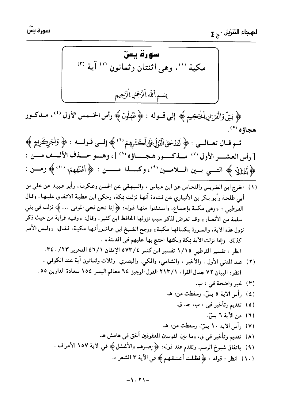 بسم الله الرّحمن الرّحيم يس والقرءان الحكيم إلى قوله: غفلون رأس الخمس الأول (¬4)، مذكور هجاؤه (¬5).