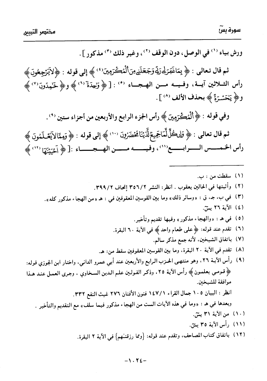 ثم قال تعالى: وإن كلّ لّما جميع لّدينا محضرون (¬10) إلى قوله: وممّا لا يعلمون رأس الخمس الرابع (¬11)، وفيه من الهجاء: [أحيينها (¬12)