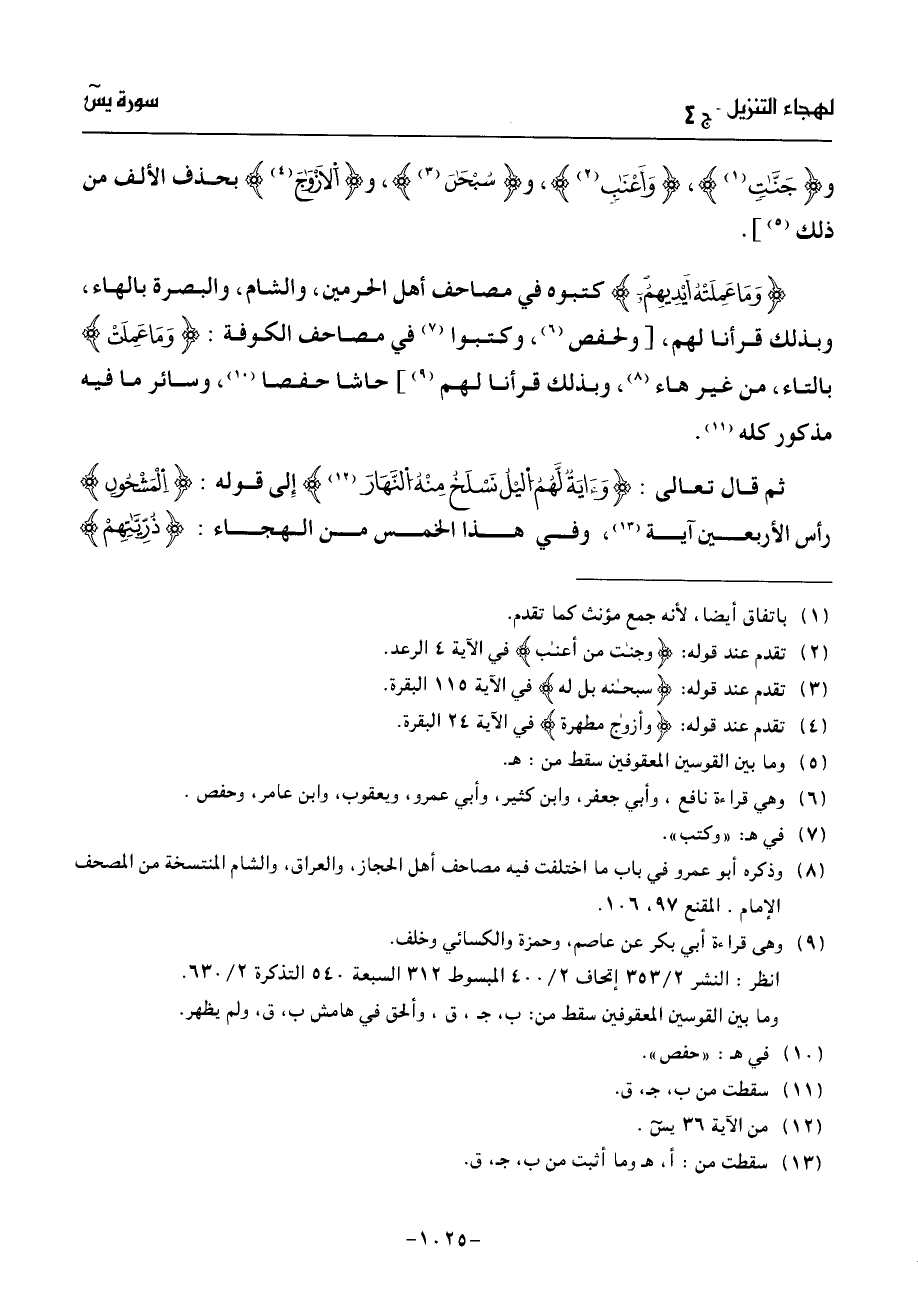 وما عملته أيديهم كتبوه في مصاحف أهل الحرمين، والشام، والبصرة بالهاء، وبذلك قرأنا لهم، [ولحفص (¬6)، وكتبوا (¬7) في مصاحف الكوفة: وما عملت بالتاء، من غير هاء (¬8)، وبذلك قرأنا لهم (¬9)] حاشا حفصا (¬10)، وسائر ما فيه مذكور كله (¬11).