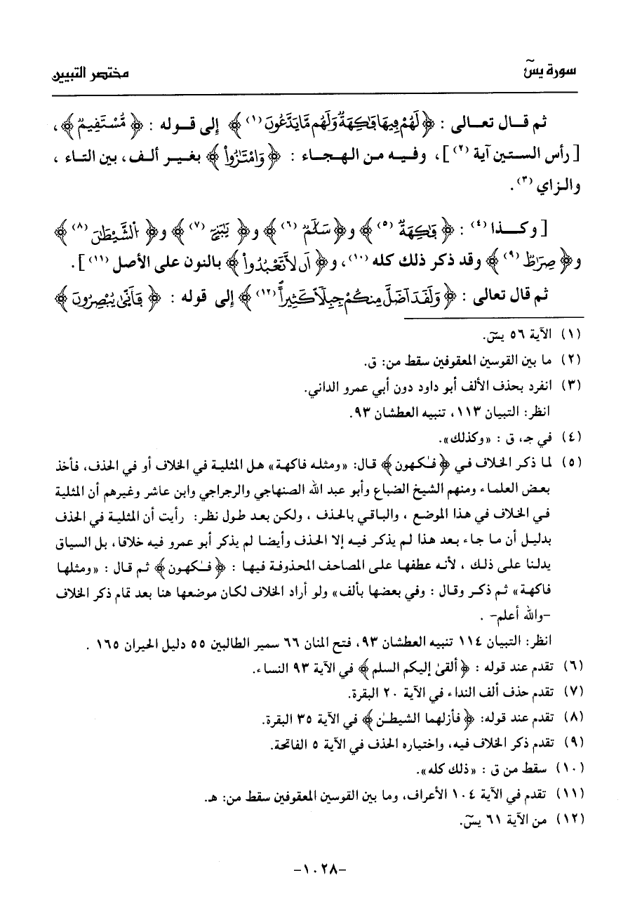 (¬5) لما ذكر الخلاف في فكهون قال: «ومثله فاكهة» هل المثلية في الخلاف أو في الحذف، فأخذ بعض العلماء ومنهم الشيخ الضباع وأبو عبد الله الصنهاجي والرجراجي وابن عاشر وغيرهم أن المثلية في الخلاف في هذا الموضع، والباقي بالحذف، ولكن بعد طول نظر: رأيت أن المثلية في الحذف بدليل أن ما جاء بعد هذا لم يذكر فيه إلا الحذف وأيضا لم يذكر أبو عمرو فيه خلافا، بل السياق يدلنا على ذلك، لأنه عطفها على المصاحف المحذوفة فيها: فكهون ثم قال: «ومثلها فاكهة» ثم ذكر وقال: وفي بعضها بألف» ولو أراد الخلاف لكان موضعها هنا بعد تمام ذكر الخلاف- والله أعلم-.