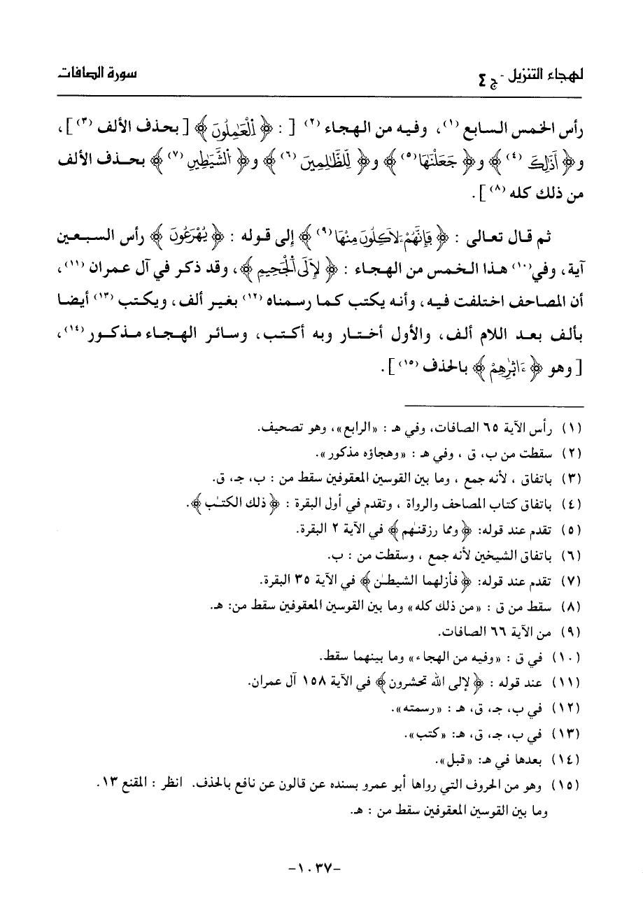 ثم قال تعالى: فإنّهم لا كلون منها (¬9) إلى قوله: يهرعون رأس السبعين آية، وفي (¬10) هذا الخمس من الهجاء: لإلى الجحيم، وقد ذكر في آل عمران (¬11)، أن المصاحف اختلفت فيه، وأنه يكتب كما رسمناه (¬12) بغير ألف، ويكتب (¬13) أيضا بألف بعد اللام ألف، والأول أختار وبه أكتب، وسائر الهجاء مذكور (¬14)، [وهو ءاثرهم بالحذف (¬15)].