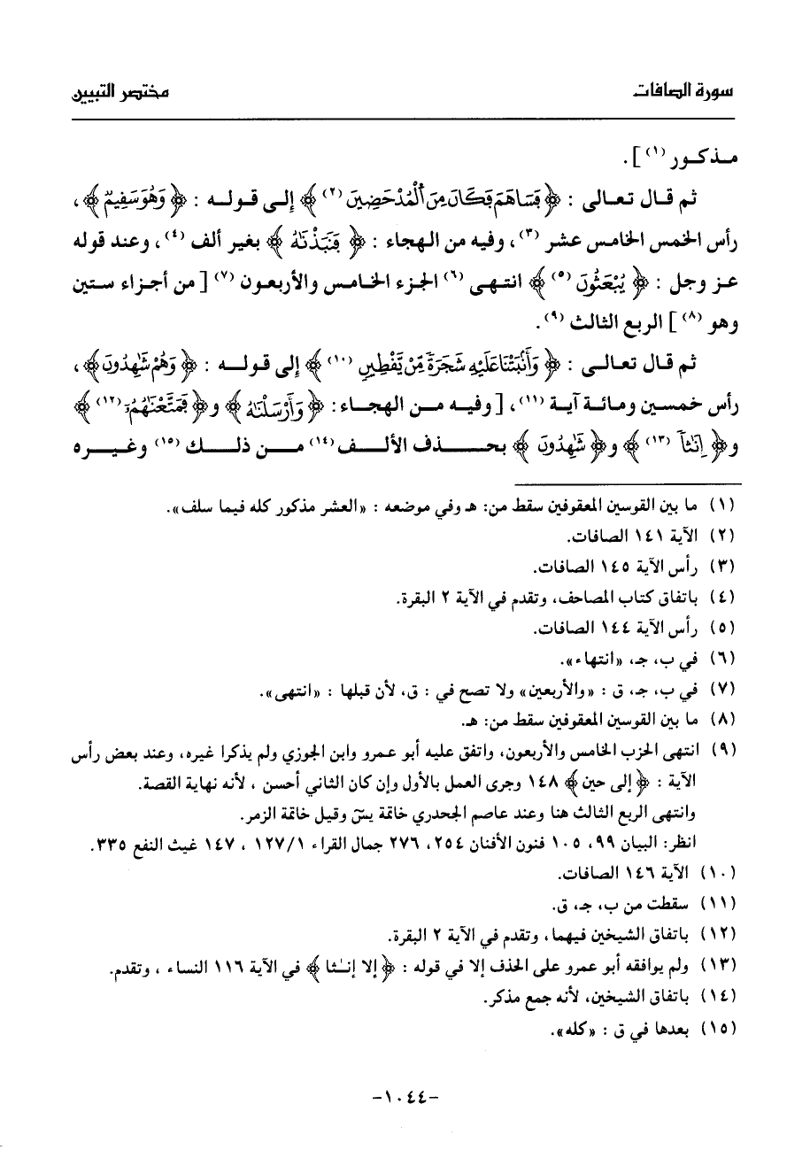 (¬9) انتهى الحزب الخامس والأربعون، واتفق عليه أبو عمرو وابن الجوزي ولم يذكرا غيره، وعند بعض رأس الآية: إلى حين 148 وجرى العمل بالأول وإن كان الثاني أحسن، لأنه نهاية القصة.