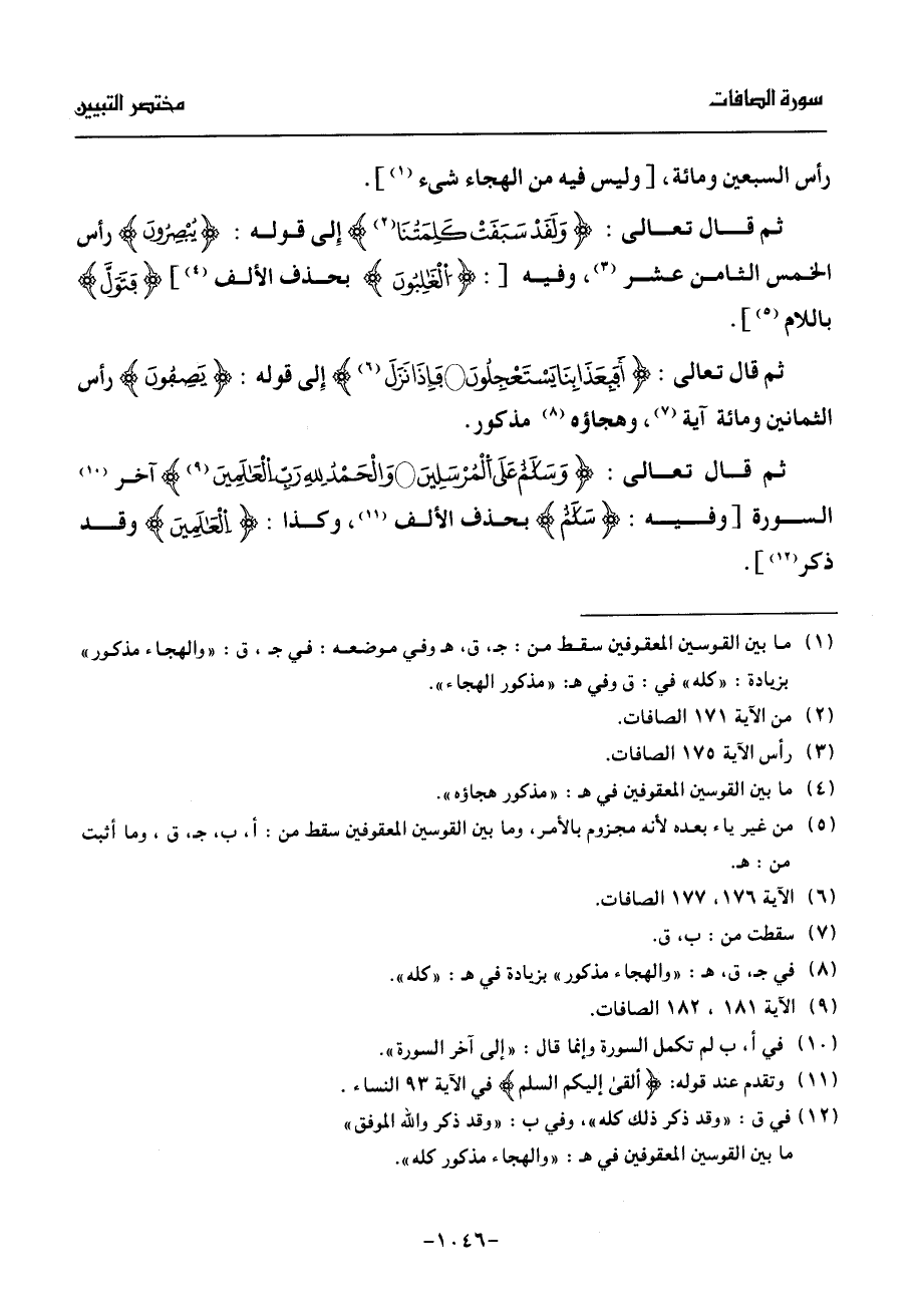 ثم قال تعالى: وسلم على المرسلين* والحمد لله ربّ العلمين (¬9) آخر (¬10) السورة [وفيه: سلم بحذف الألف (¬11)، وكذا: العلمين وقد ذكر (¬12)].