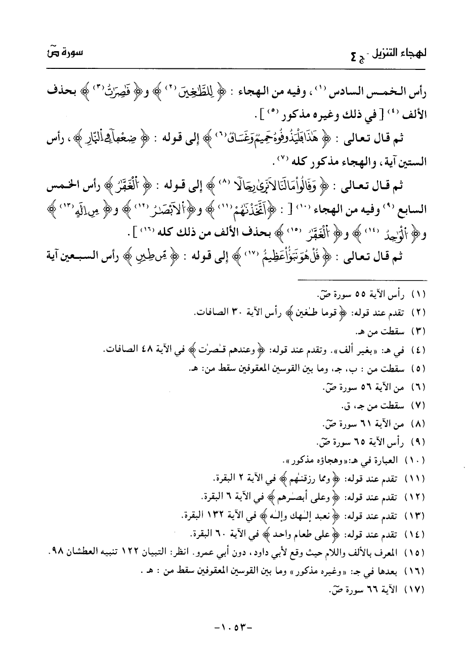 ثم قال تعالى: وقالوا ما لنا لا نرى رجالا (¬8) إلى قوله: الغفّر رأس الخمس السابع (¬9) وفيه من الهجاء (¬10) [: أتّخذنهم (¬11) والابصر (¬12) ومن اله (¬13) والوحد (¬14) والغفّر (¬15) بحذف الألف من ذلك كله (¬16)].