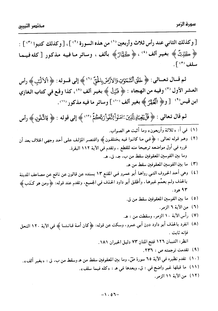 ثم قال تعالى: خلق السّموت والارض بالحقّ (¬6) إلى قوله: الالبب رأس العشر الأول (¬7) وفيه من الهجاء: فنت بغير ألف (¬8)، كذا وقع في كتاب الغازي ابن قيس (¬9) [والغفّر بغير ألف (¬10)] وسائر ما فيه مذكور (¬11).