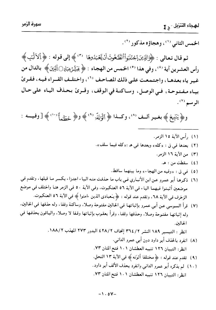 ثم قال تعالى: والذين اجتنبوا الطّغوت أن يّعبدوها (¬3) إلى قوله: الالبب رأس العشرين آية (¬4)، وفي هذا (¬5) الخمس من الهجاء: فبشّر عباد* الذين بالدال من غير ياء بعدها، واجتمعت على ذلك المصاحف (¬6)، واختلف القراء فيه، فقرئ بياء مفتوحة، في الوصل، وساكنة في الوقف، وقرئ بحذف الياء على حال الرسم (¬7).