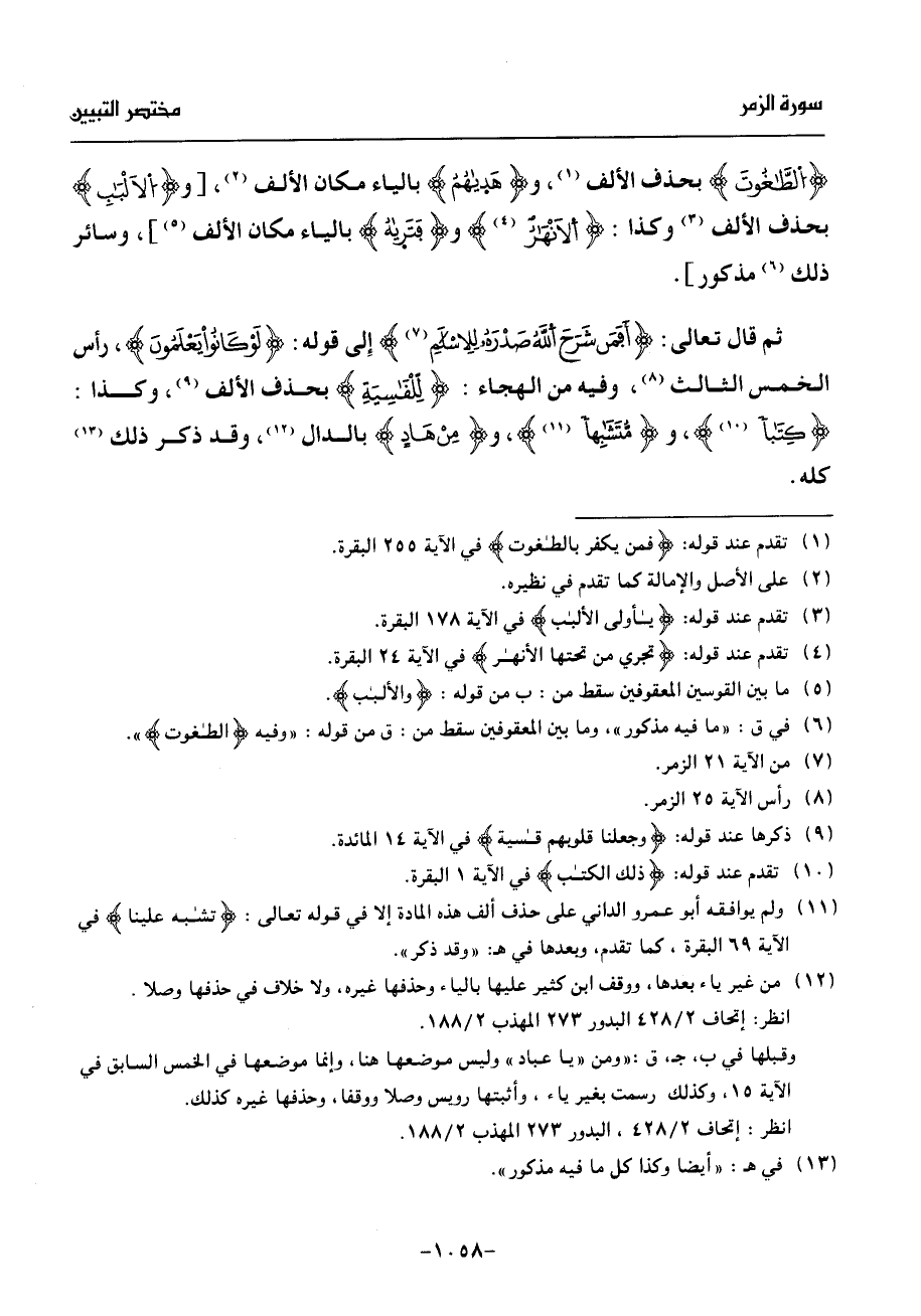 الطّغوت بحذف الألف (¬1)، وهديهم بالياء مكان الألف (¬2)، [والالبب بحذف الألف (¬3) وكذا: الانهر (¬4) وفتريه بالياء مكان الألف (¬5)]، وسائر ذلك (¬6) مذكور].