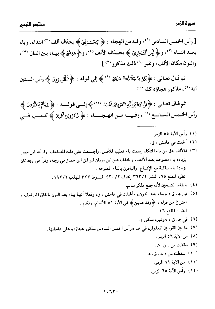 ثم قال تعالى: قل افغير الله تامرونى أعبد (¬11) إلى قوله: قيام ينظرون رأس الخمس السابع (¬12)، وفيه من الهجاء: تامرونى أعبد كتب في