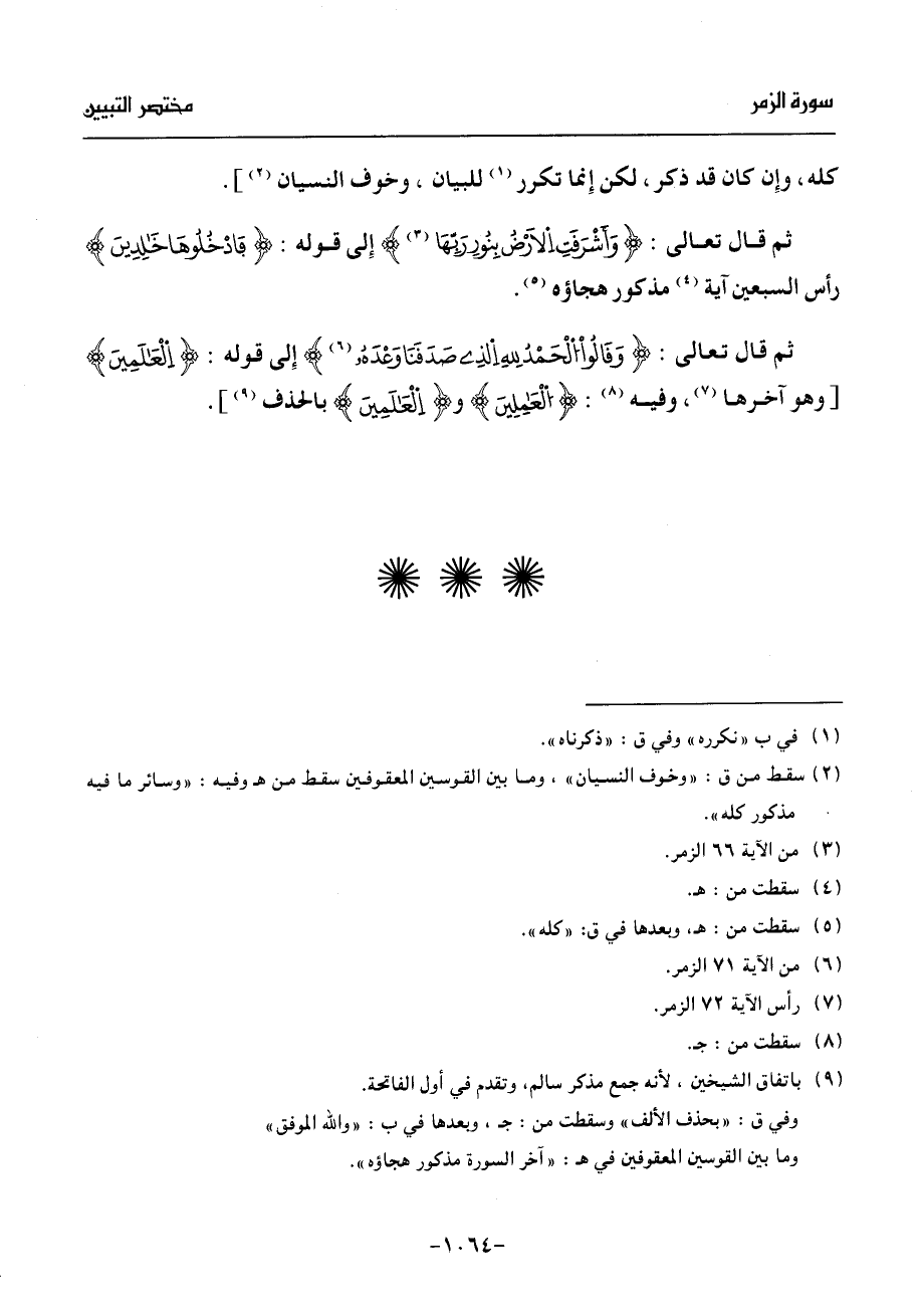 ثم قال تعالى: وأشرقت الارض بنور ربّها (¬3) إلى قوله: فادخلوها خلدين رأس السبعين آية (¬4) مذكور هجاؤه (¬5).