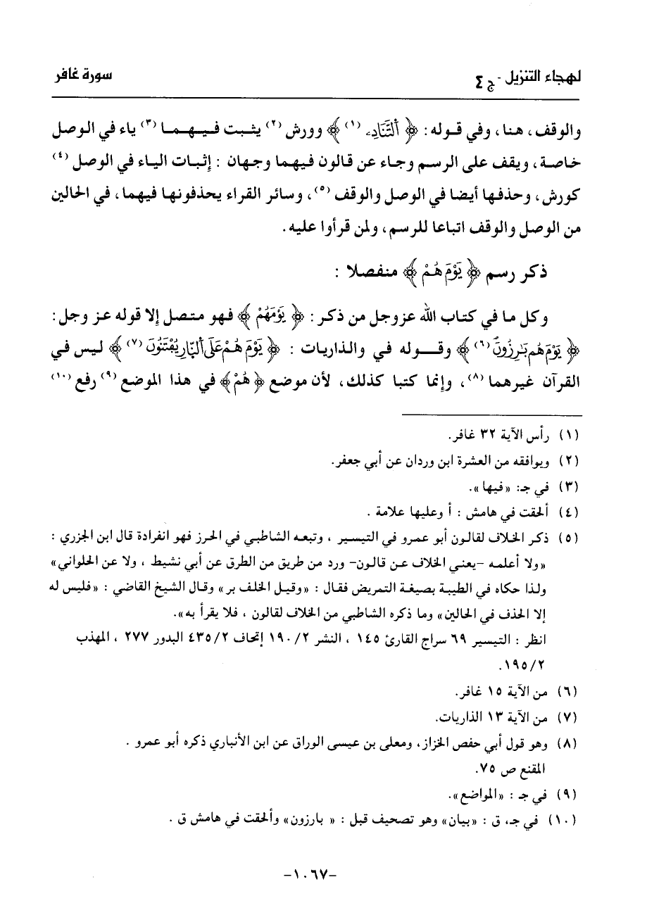 والوقف، هنا، وفي قوله: التّناد (¬1) وورش (¬2) يثبت فيهما (¬3) ياء في الوصل خاصة، ويقف على الرسم وجاء عن قالون فيهما وجهان: إثبات الياء في الوصل (¬4) كورش، وحذفها أيضا في الوصل والوقف (¬5)، وسائر القراء يحذفونها فيهما، في الحالين من الوصل والوقف اتباعا للرسم، ولمن قرءوا عليه.