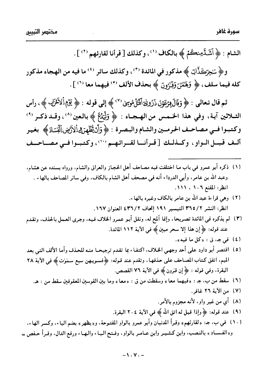 (¬5) اقتصر أبو داود على أحد وجهي الخلاف، اكتفاء بما تقدم ترجيحا منه للحذف وأما الألف التي بعد الميم، اتفق كتاب المصاحف على حذفها، وتقدم عند قوله: فسويهن سبع سموت في الآية 28 البقرة، وفي قوله: إن قرون في الآية 76 القصص.